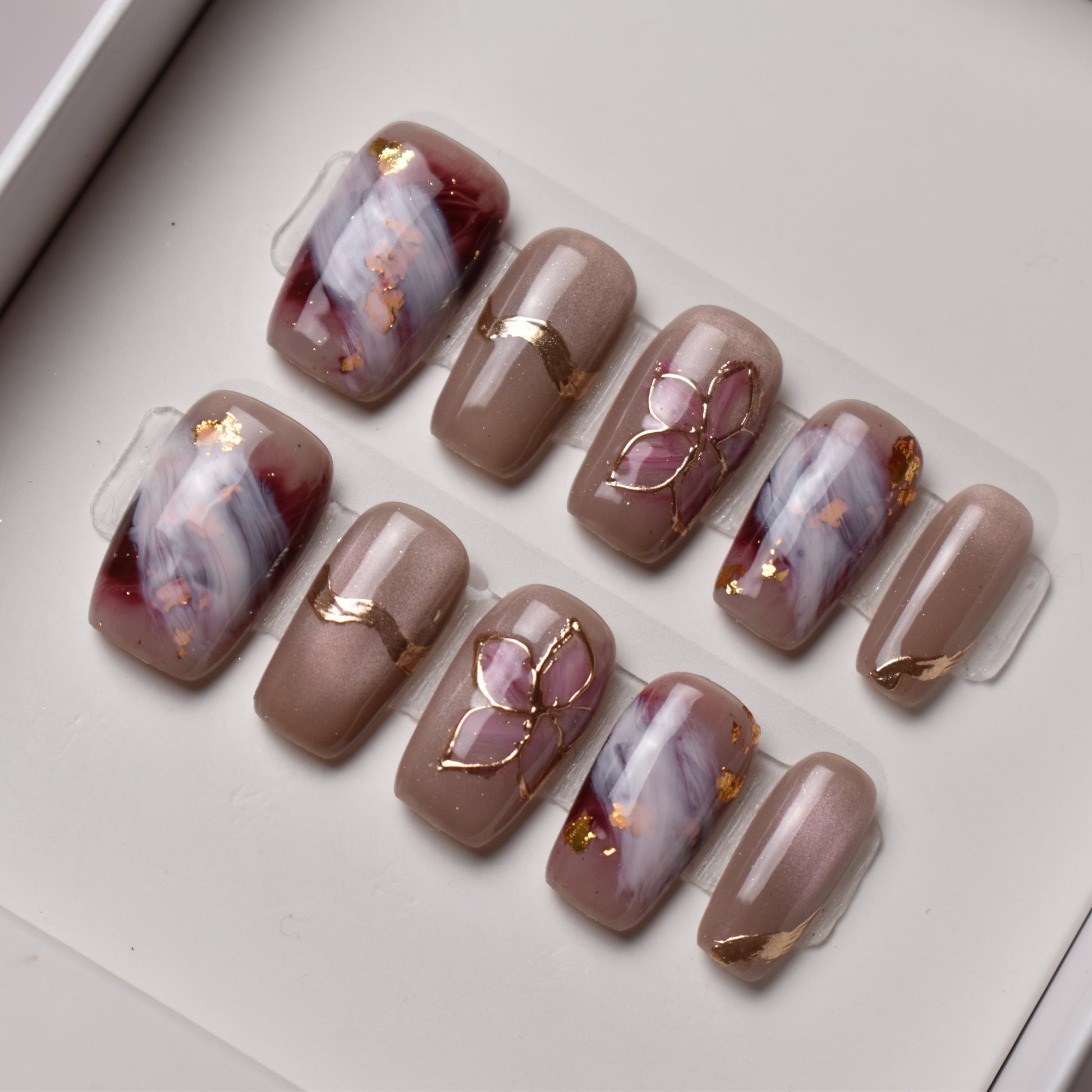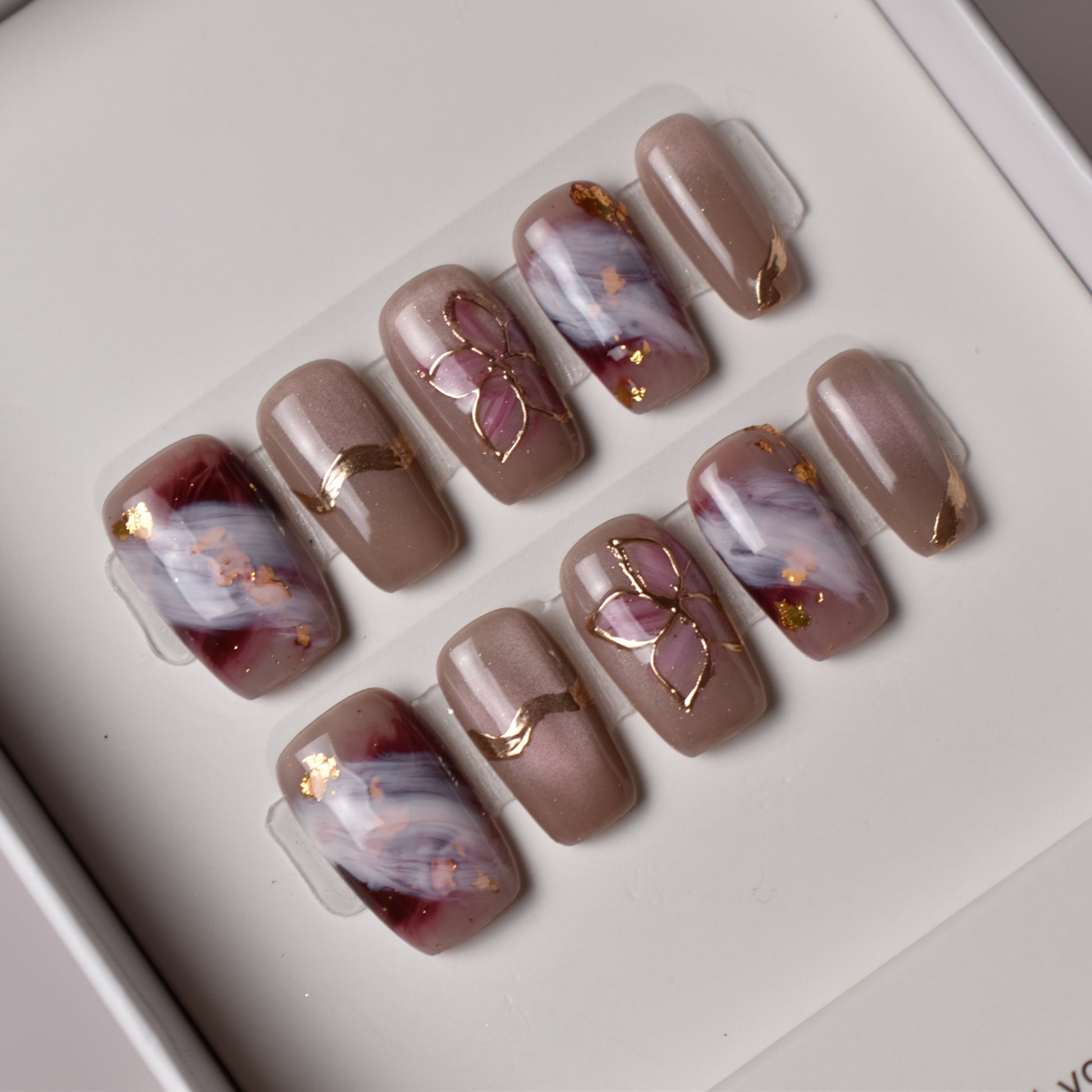 A regal set of press-on nails that blends deep wine red and earthy brown tones with metallic gold accents. Features include textured gold hearts, artistic swirl embellishments, and bold gold-and-silver framed rhinestones. Brushstroke effects in white and gray add a painterly touch, while glossy finishes and strategic metallic highlights evoke an air of refined elegance and strength.