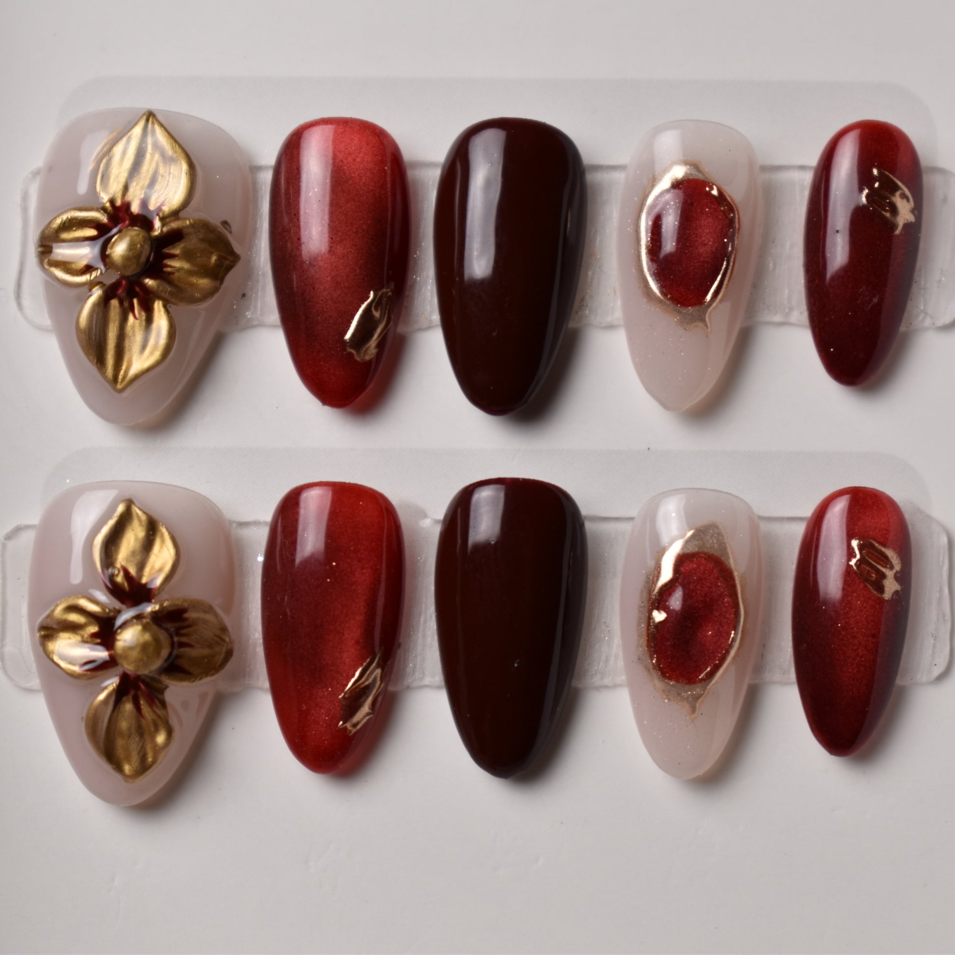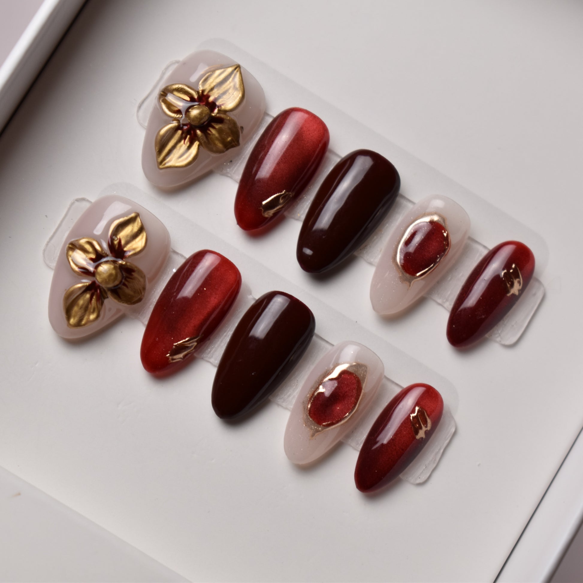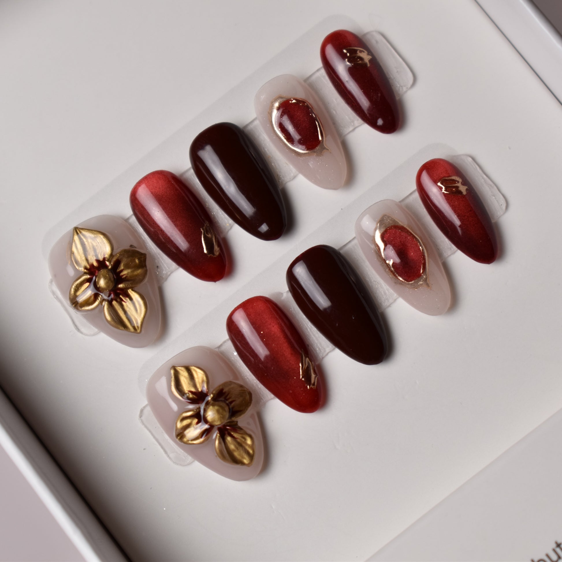 A striking combination of deep chocolate brown and rich crimson red gel, enhanced with a luminous red-to-burgundy gradient. The focal nails boast 3D sculpted gold flowers with a glossy top coat, while others display molten gold gel accents floating over translucent nude bases.