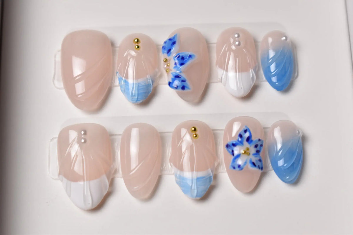 A serene ode to tranquil mornings, this set pairs translucent nude tones with soft blue gradients, each nail kissed by hand-painted camellias in deep indigo. Gold and pearl accents glimmer like dew, capturing the quiet poetry of a garden before sunrise.