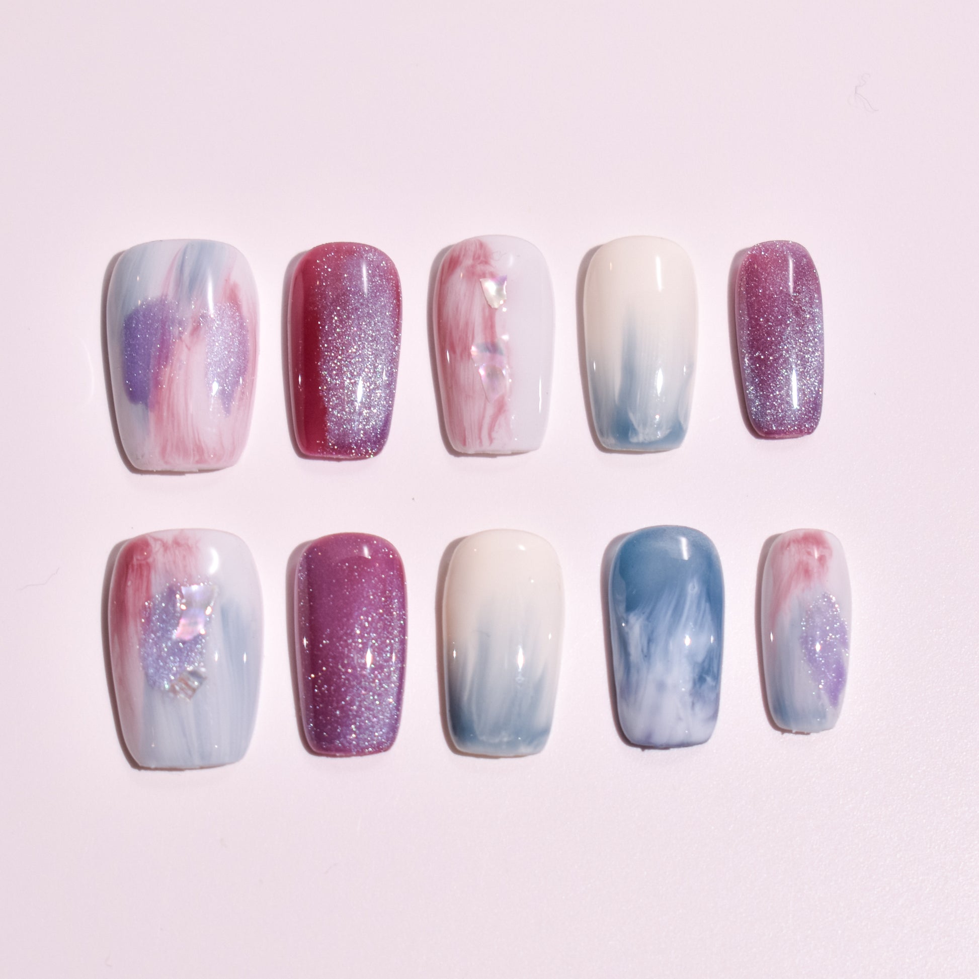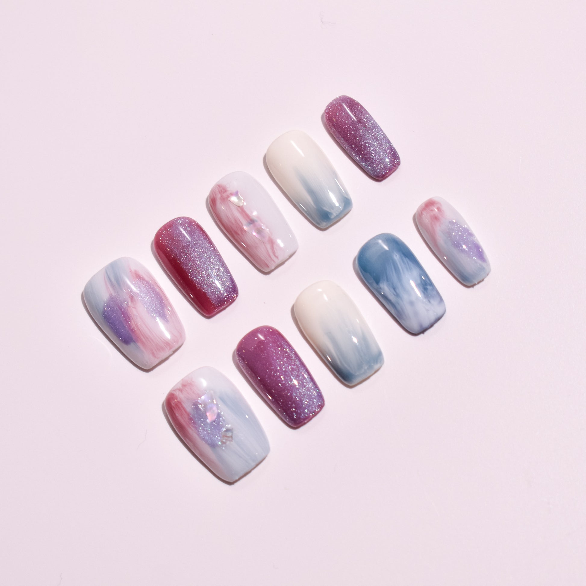 This design features a harmonious blend of dusty rose glitter, lavender shimmer, and misty blue marble gradients layered over a milky neutral base. Subtle marbling mimics drifting petals and clouds, while select accent nails are adorned with iridescent crystal flakes that catch the light with every movement.