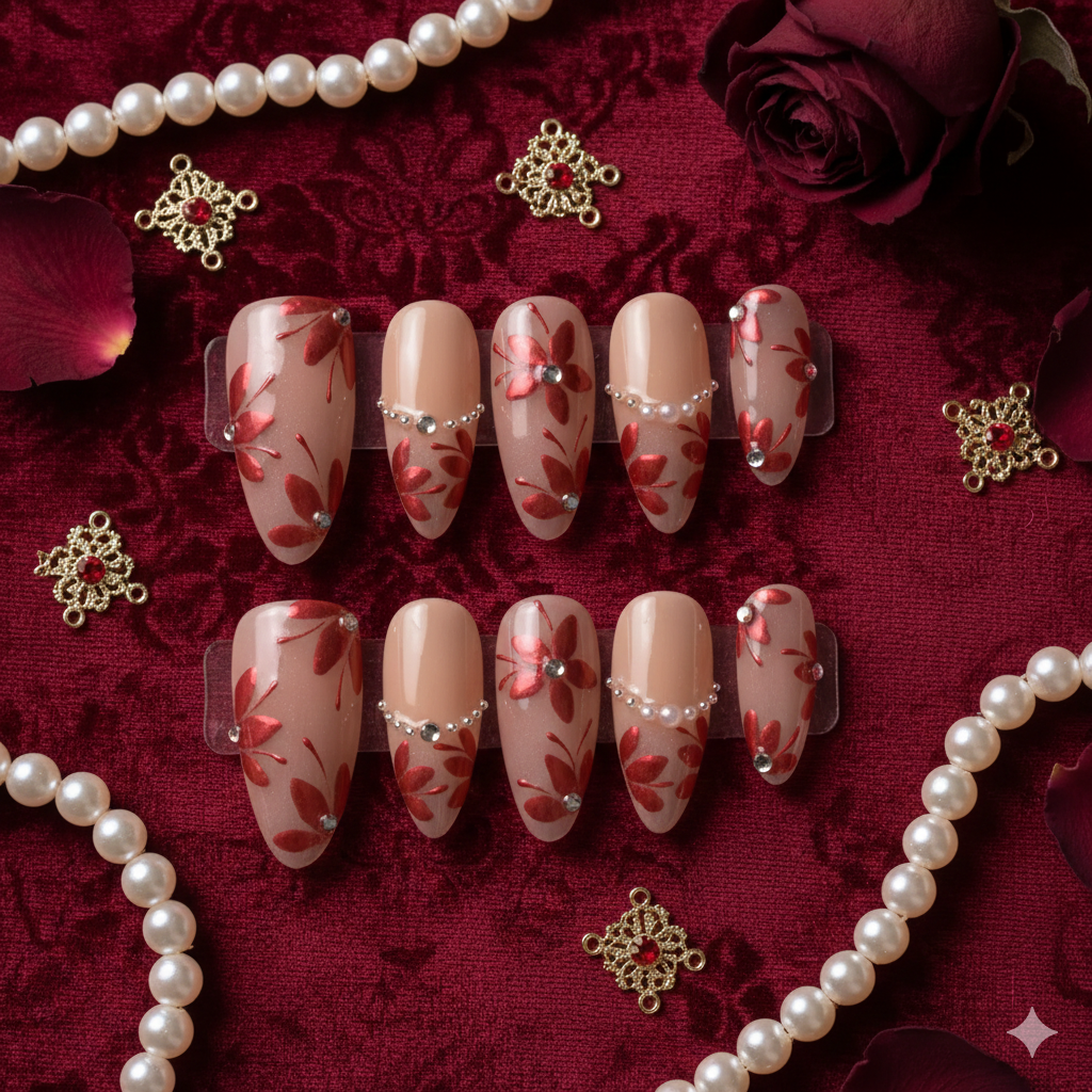 Romantic and bold, our Akahana no Koi press-on nail set channels the elegance of Japanese floral motifs with a modern twist. A soft nude base provides the perfect canvas for striking metallic red blossoms, each petal outlined for depth and shimmer. Sparkling rhinestones and pearls add a touch of glamour, creating a look that’s both sophisticated and eye-catching. This design draws inspiration from traditional Japanese patterns often seen in kimonos, reimagined for contemporary wear.