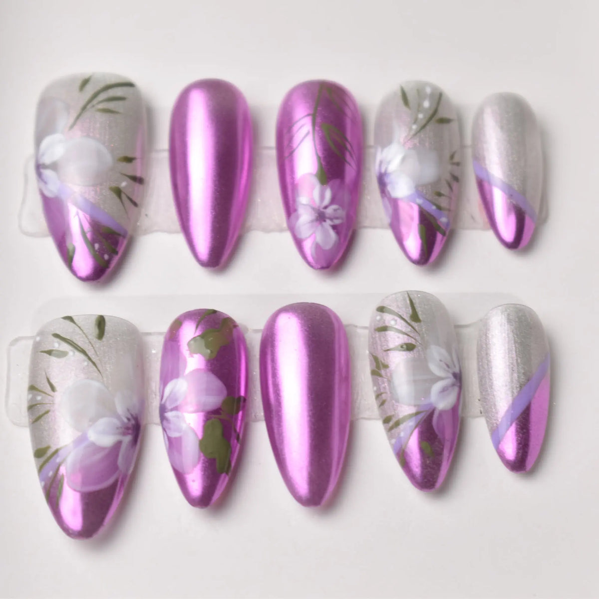 Bold yet graceful, our Murasaki Hana press-on nail set draws inspiration from the elegance of Japanese floral motifs and the striking beauty of kimono patterns. Featuring a radiant metallic purple paired with shimmering silver, each nail is adorned with hand-painted white blossoms and delicate green leaves. The combination of vibrant color and intricate floral artistry makes this set perfect for channeling a mix of modern glam and traditional Japanese charm.