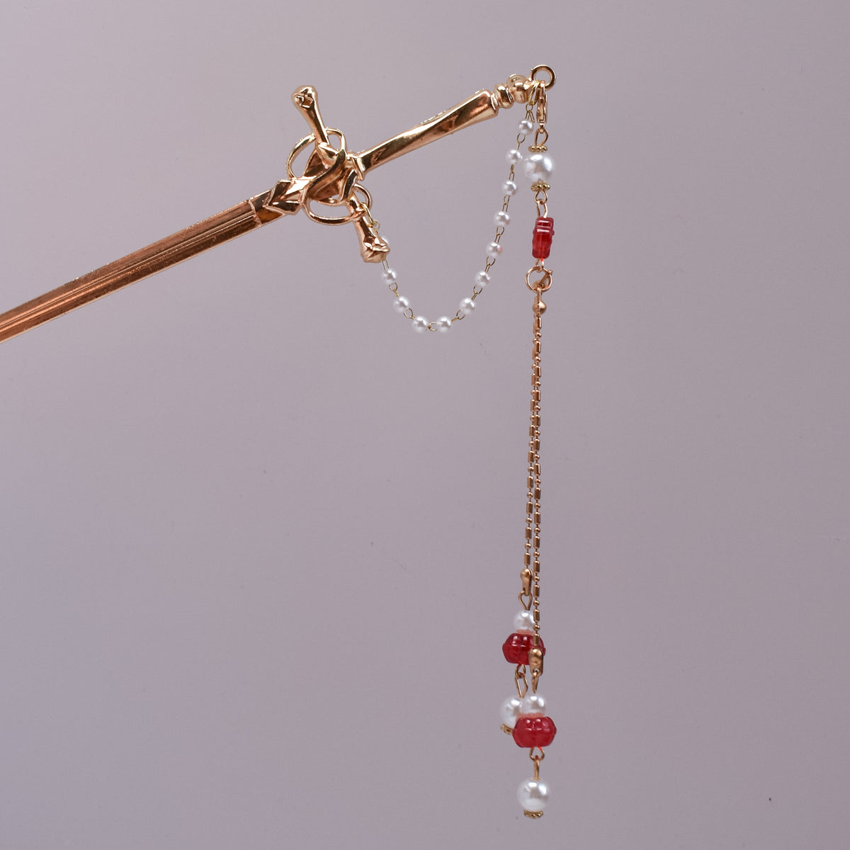 Crimson Pearl Sword Hairpin – Rose Gold Blade with Red Beads & Pearl Drops