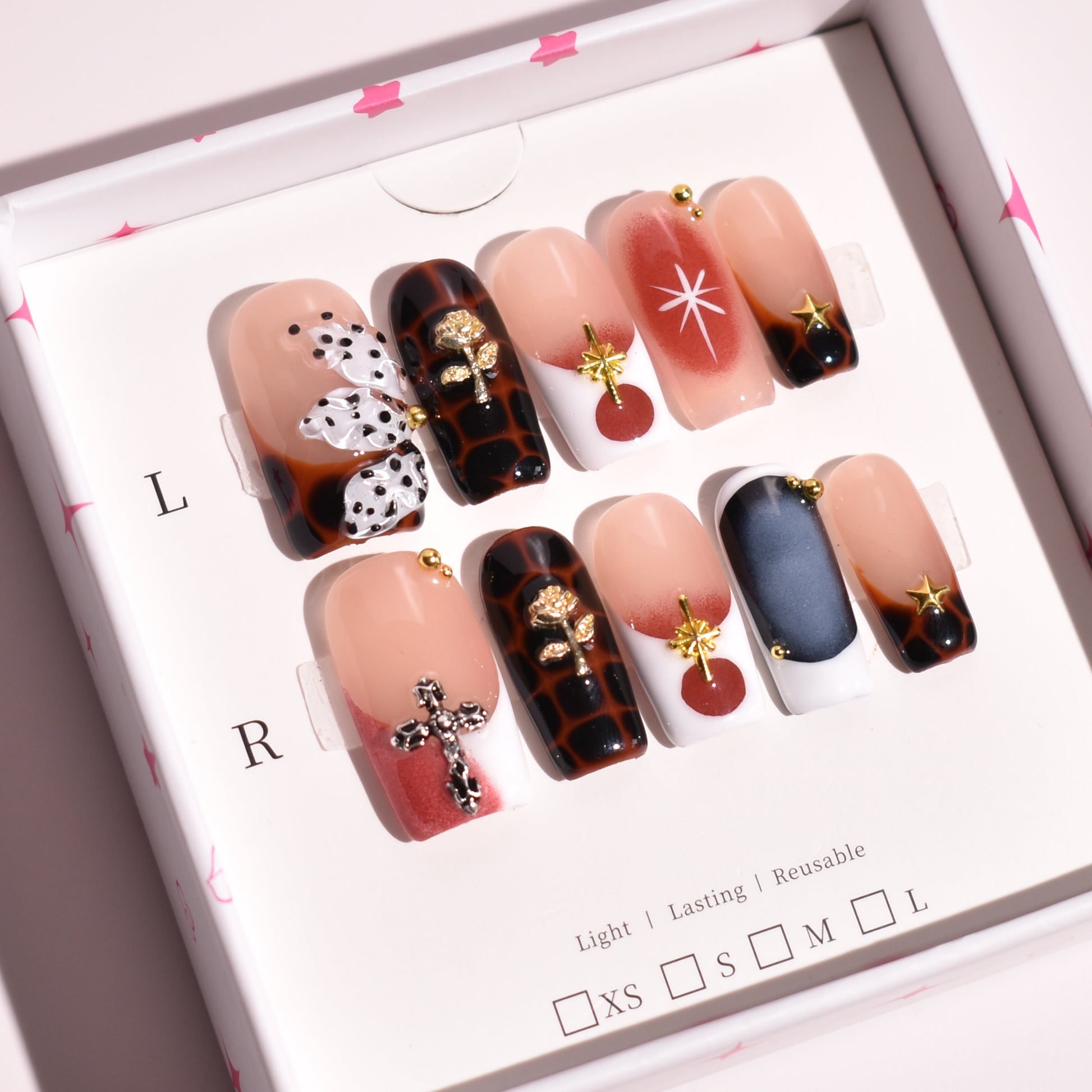 Lightweight, reusable, and durable, Nocturne Relic is ideal for those searching for medium square press-on nails, tortoiseshell nails, vintage-inspired nails, gold cross nail designs, moody neutral nails, and statement fall press-ons. Perfect for everyday edge, styled photoshoots, or refined seasonal glam.