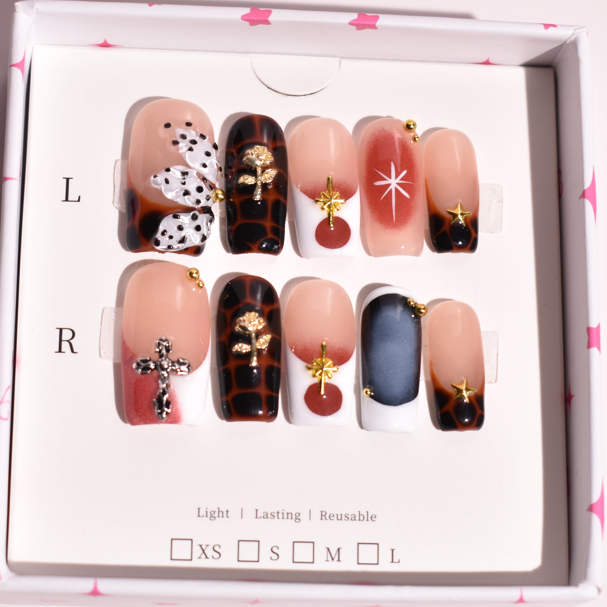 Nocturne Relic is a handcrafted medium square press-on nail set blending tortoiseshell patterning, warm rust gradients, celestial detailing, and antique-inspired metallic accents. Built on a soft nude base, this design features rich brown tortoise overlays, deep red airbrushed fades, matte charcoal contrast, gold star studs, cross embellishments, and delicate sculpted accents for a modern heirloom aesthetic.