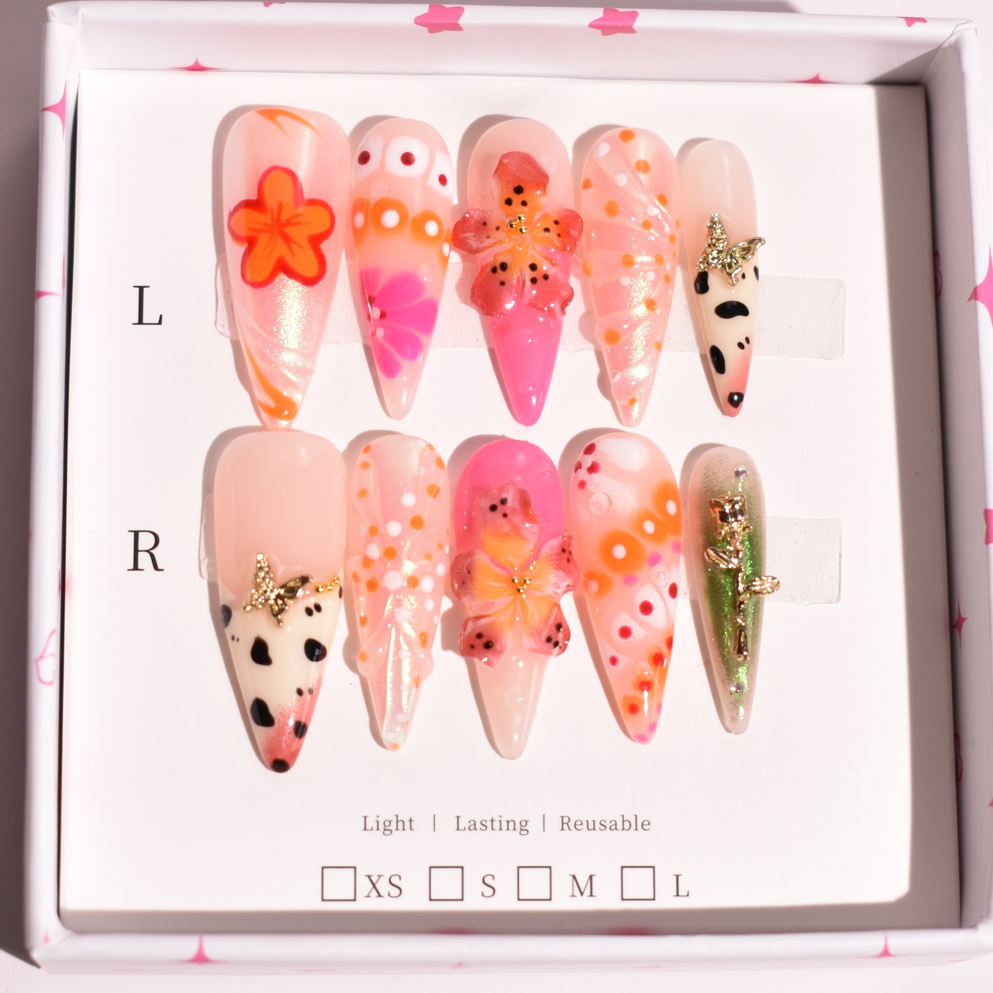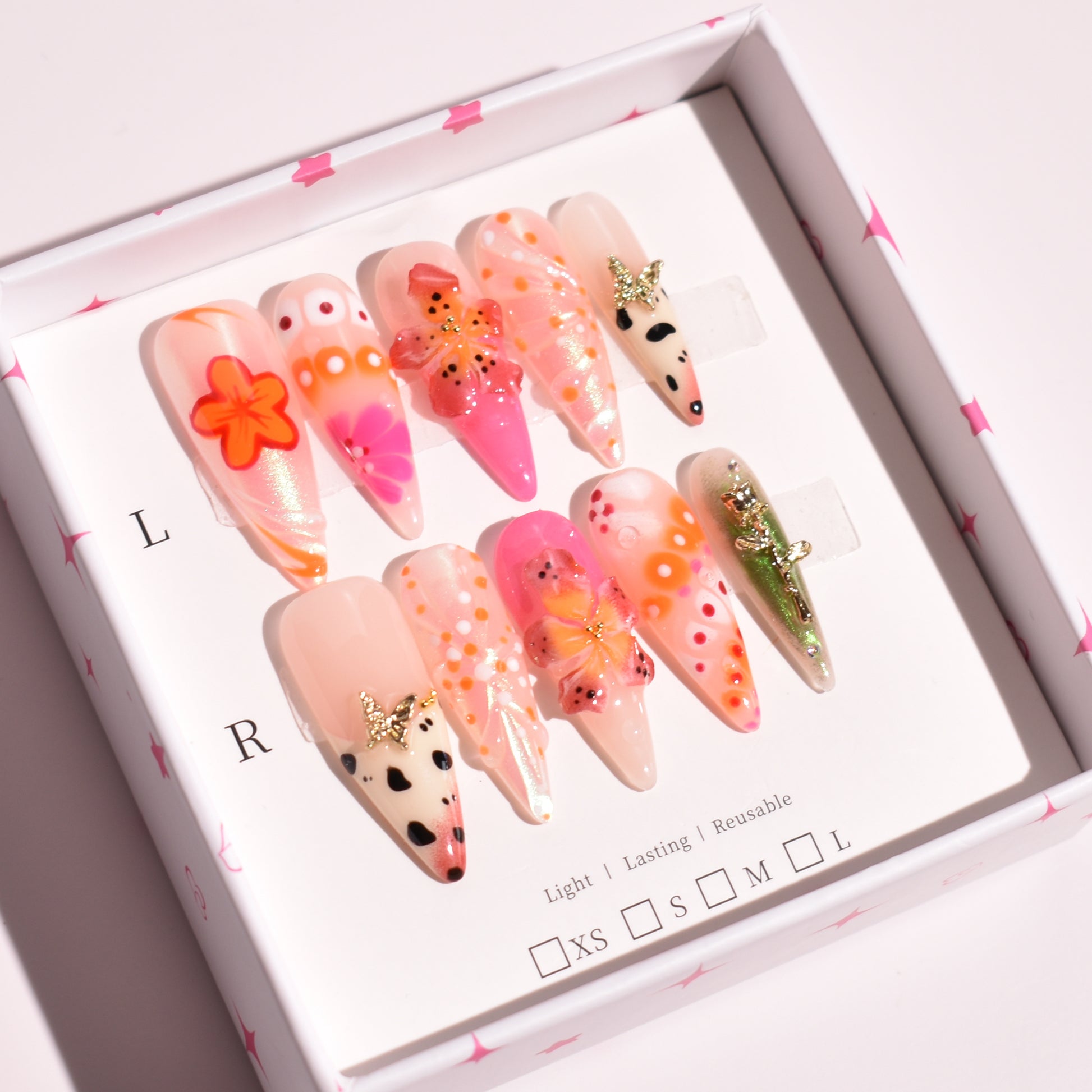 - 10 uniquely designed, hand-painted press-on nails made with high-quality UV gel.