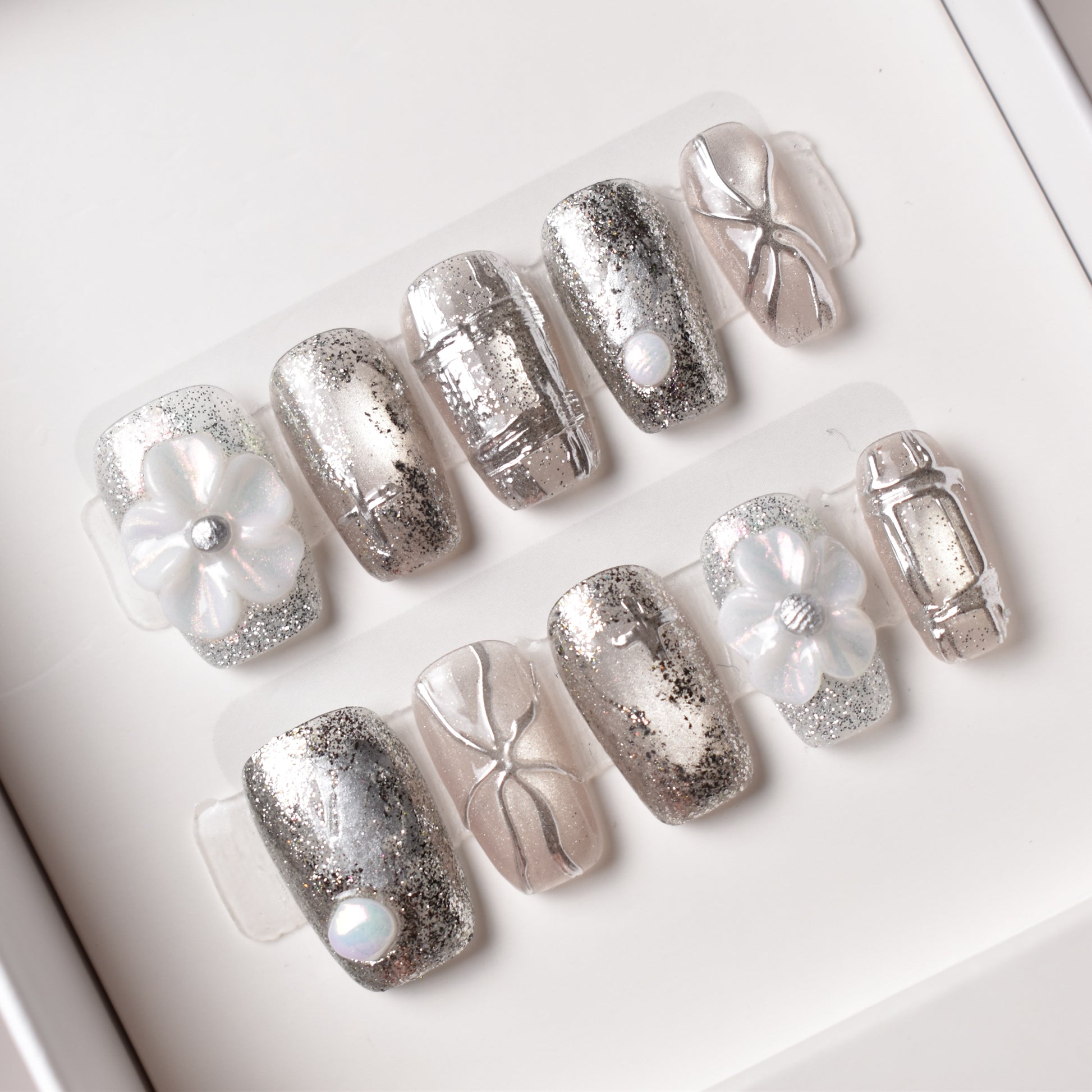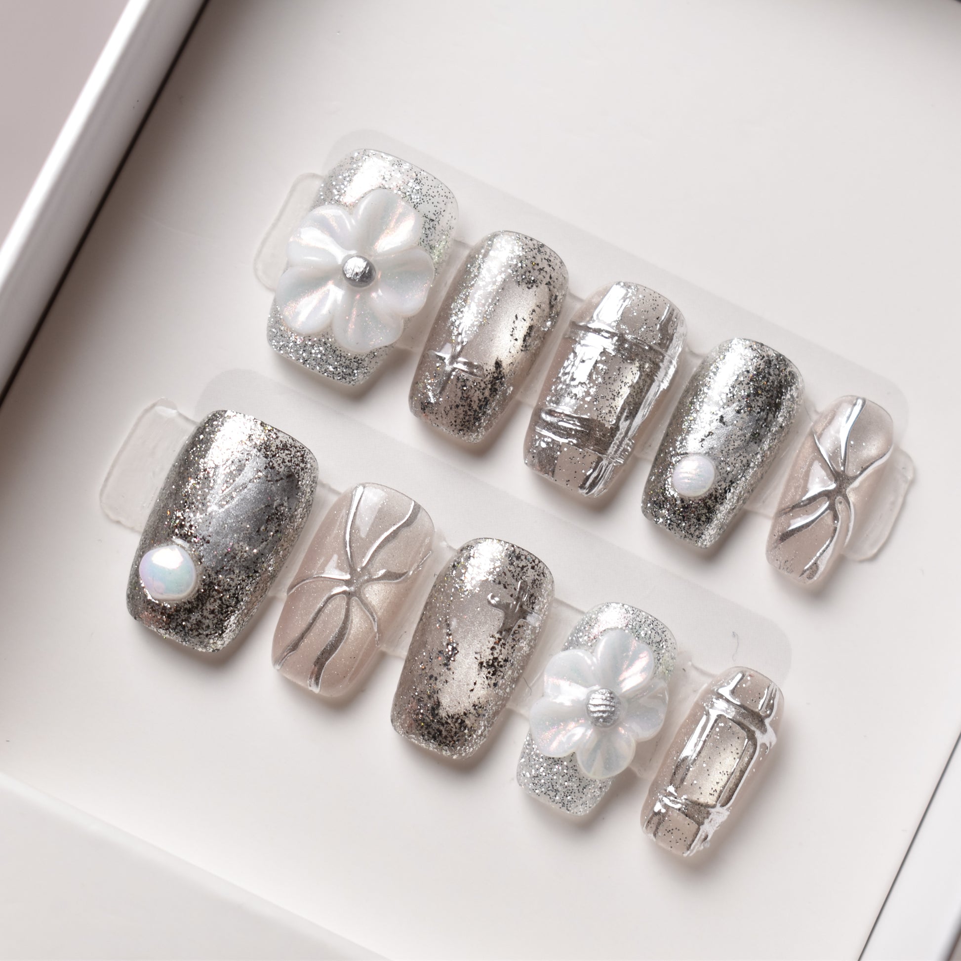 Glamorous yet tender, this set shimmers with silver foil, glitter, and pearlescent flowers. Tiny bows add a romantic touch, while the luminous finish makes each nail feel like a precious keepsake. Ideal for festive occasions, winter soirées, and moments that deserve a little extra sparkle.