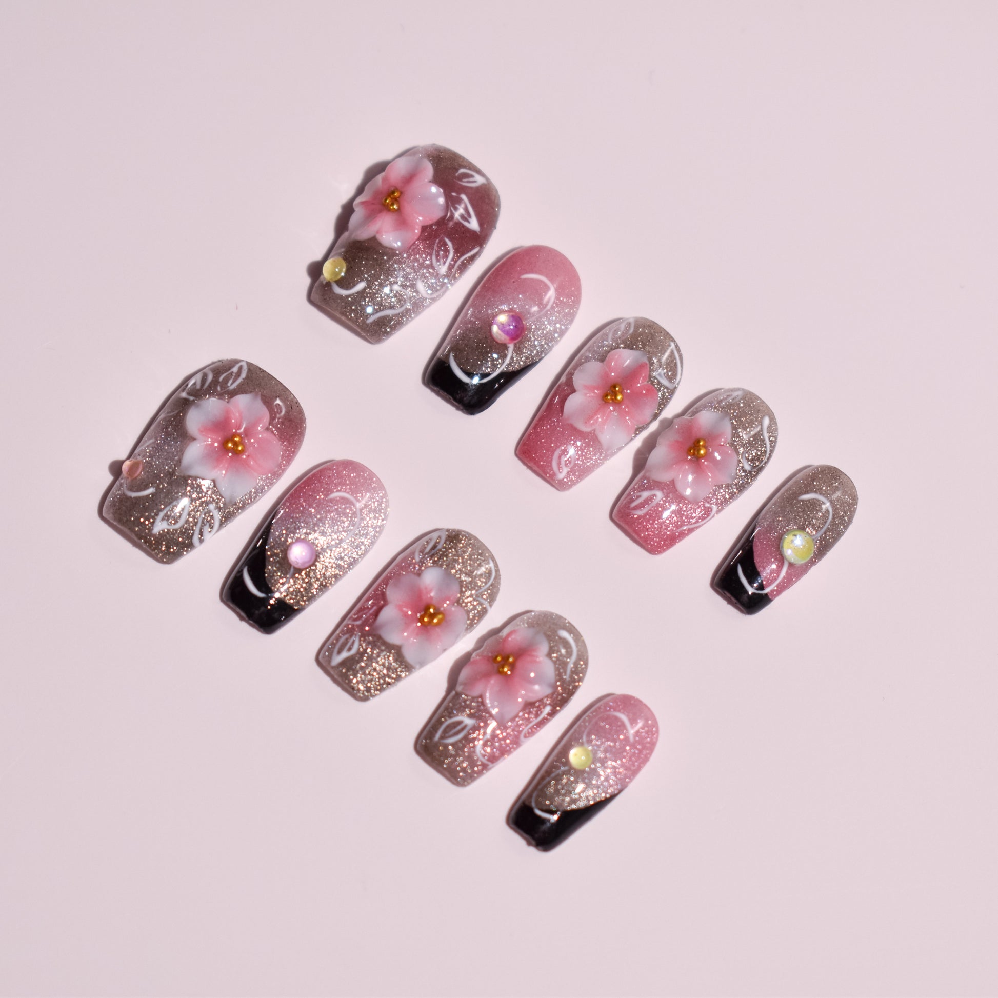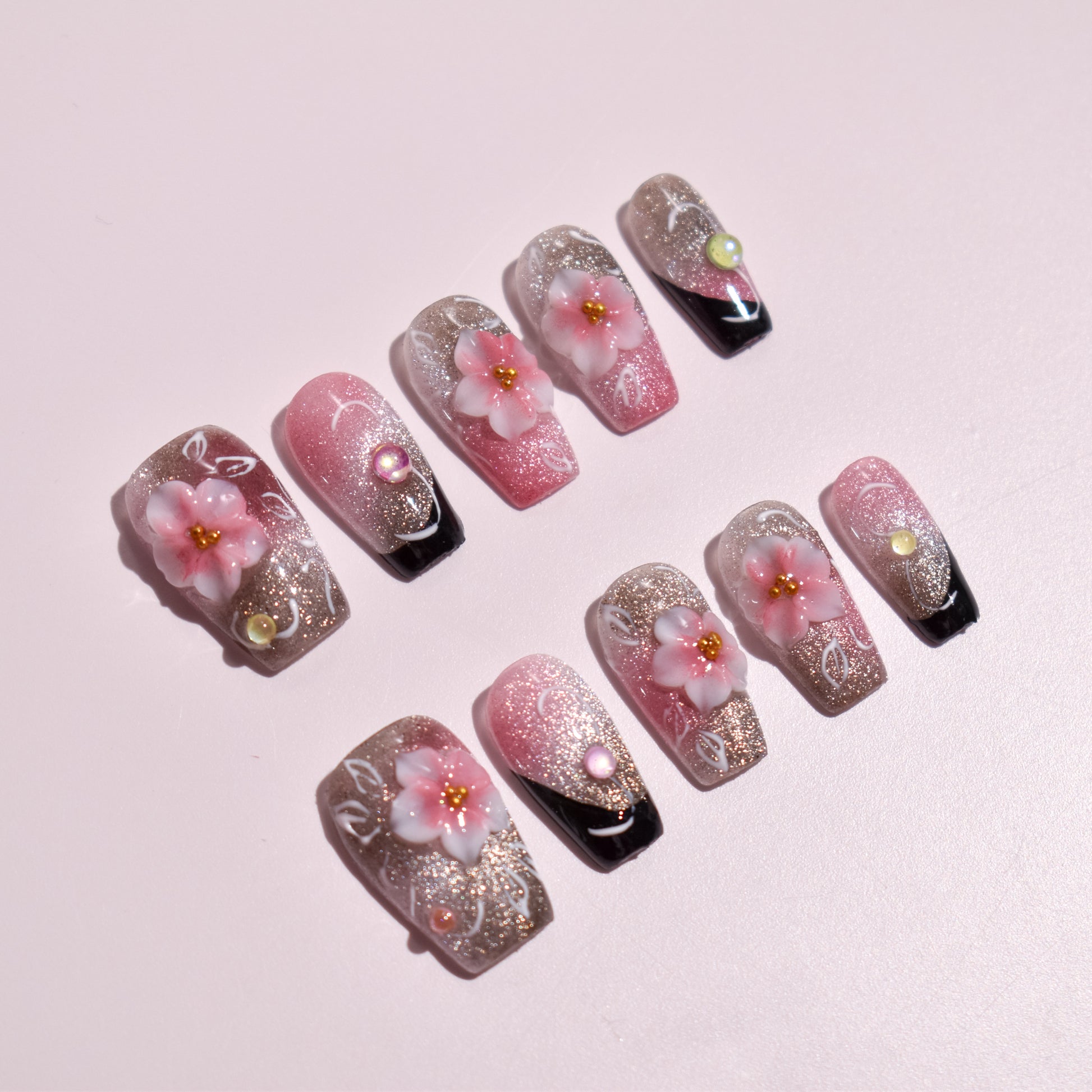 Design: Hand-sculpted sakura flowers, glitter gradients, pearl accents, fine line art