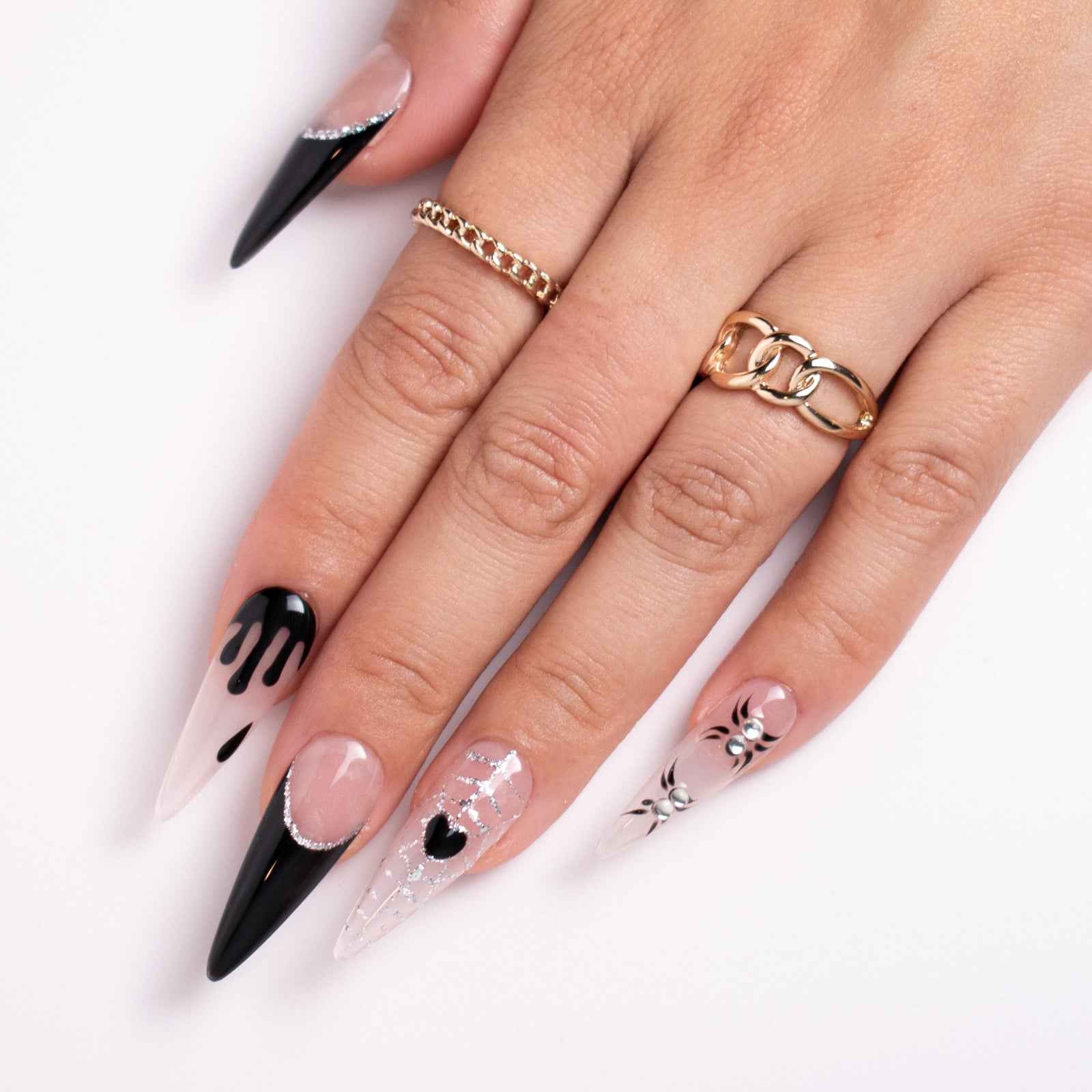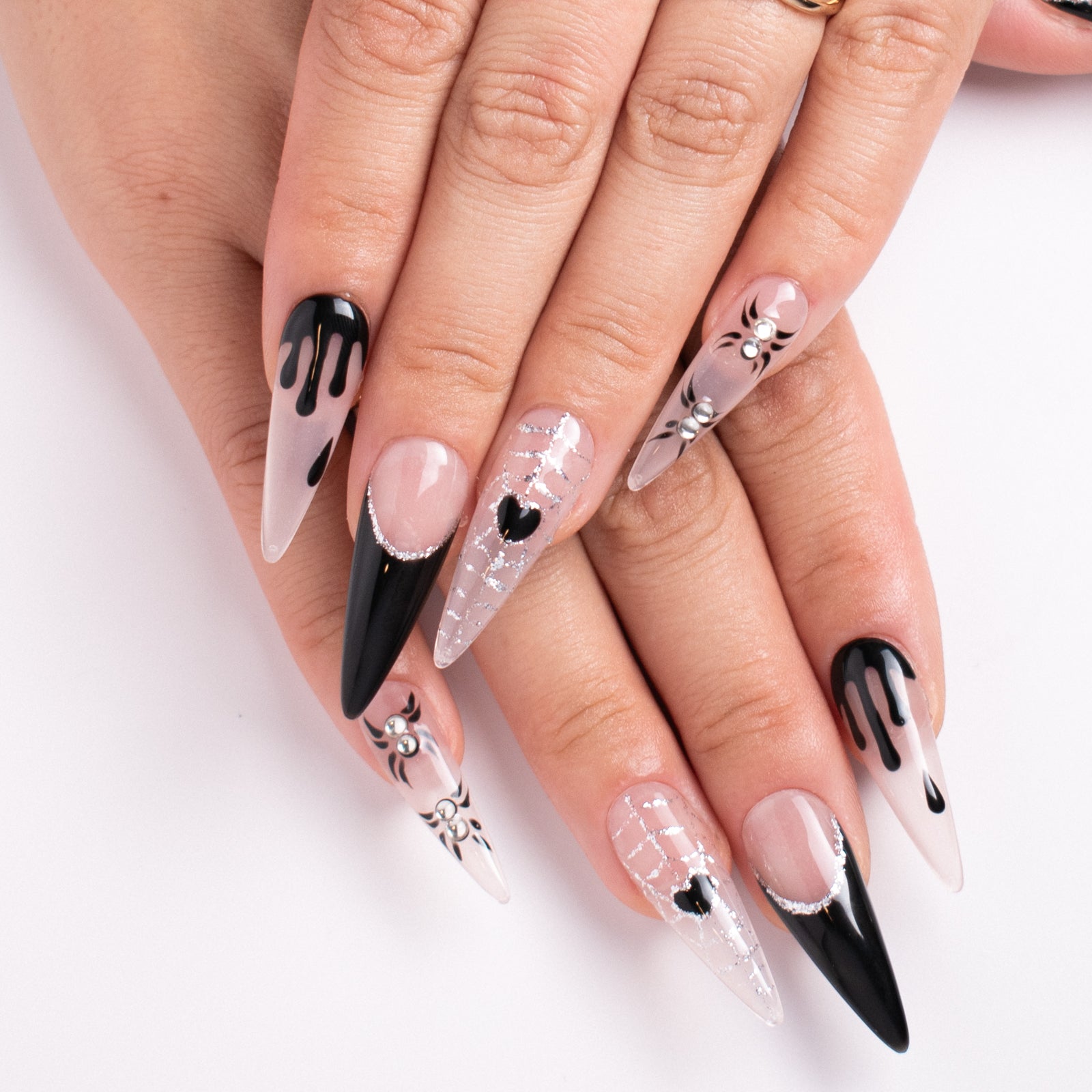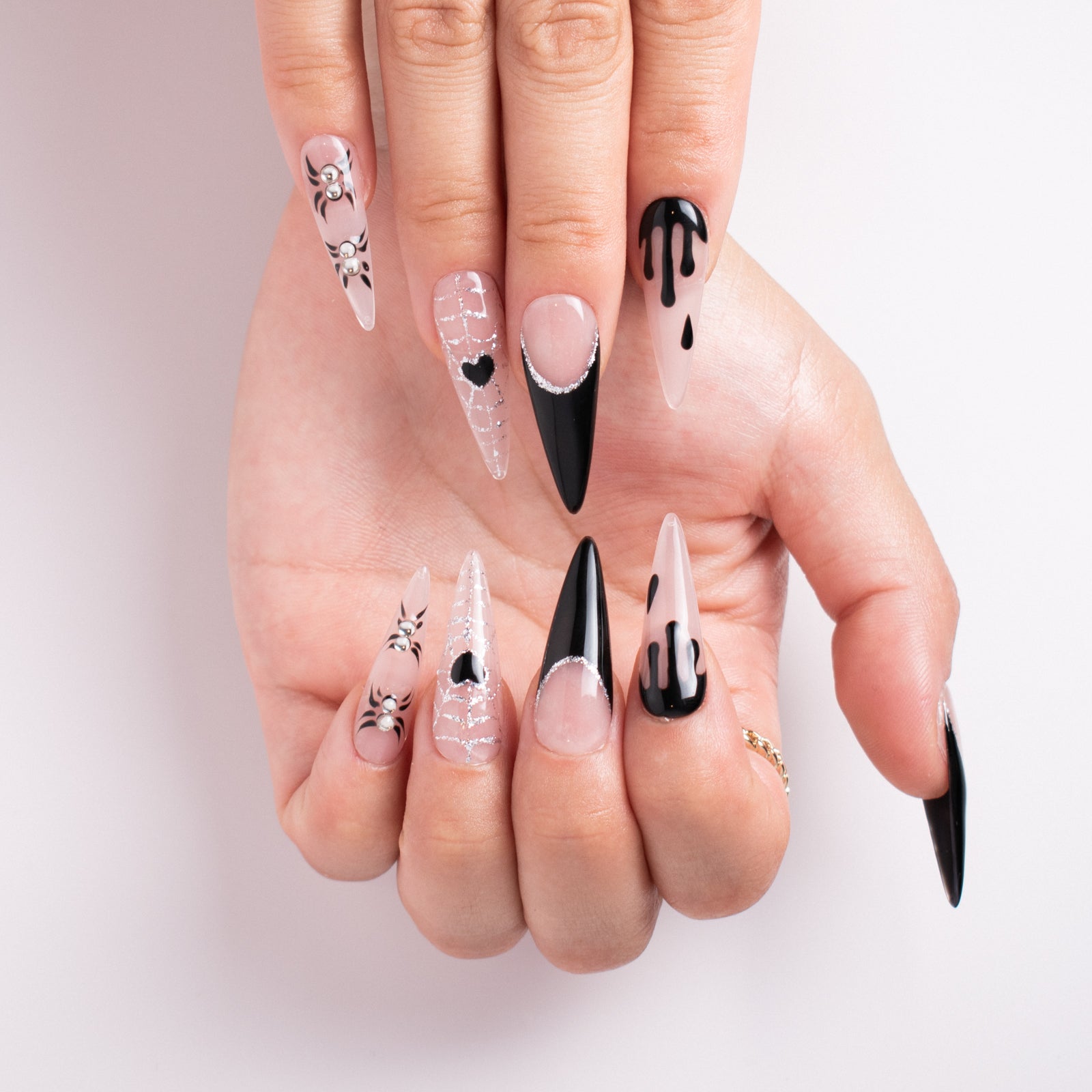 Unveil your dark side with the Midnight Web press-on nail set! These 33mm stiletto-shaped nails showcase an edgy, gothic style with black dripping designs, silver spider web accents, and daring rhinestones. The perfect accessory for your Halloween or spooky-season look!