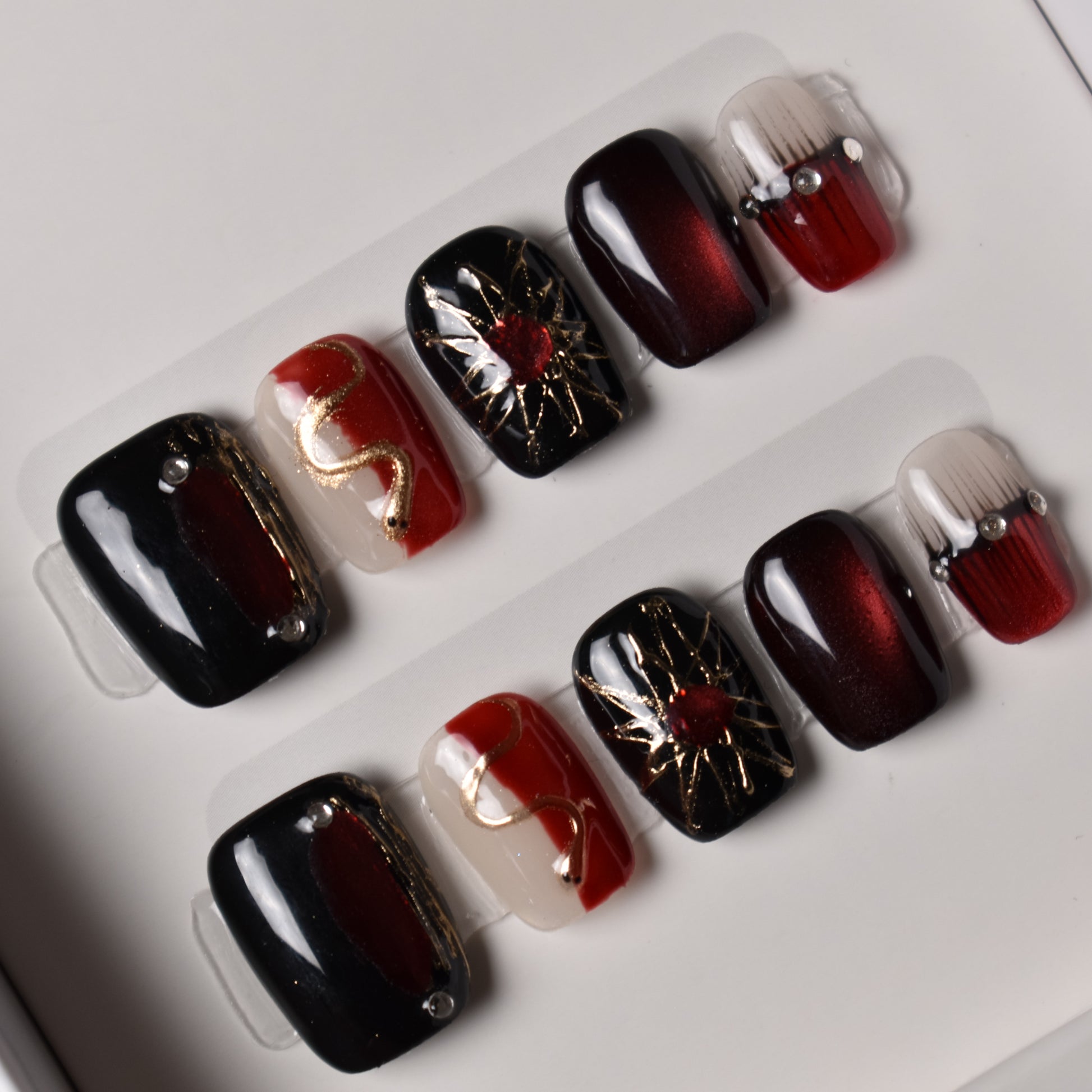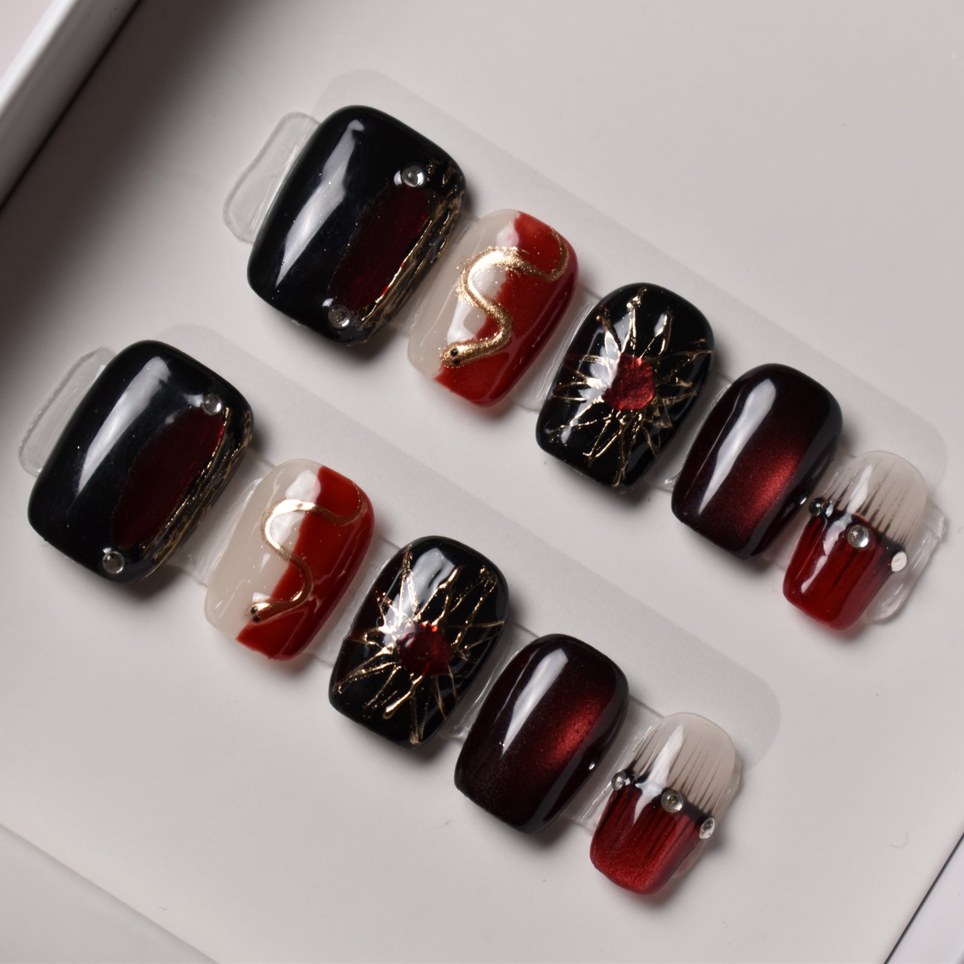 This striking set weaves together the power of the serpent with the drama of deep night hues. Glossy black and crimson gradients evoke a sense of danger and allure, while a golden snake coils with quiet menace across a blood-red accent. A shattered glass heart bursts in molten gold, symbolizing passion and peril, while jewel-studded tips add a final touch of opulence. Perfect for evenings that call for mystery, seduction, and a hint of rebellion.