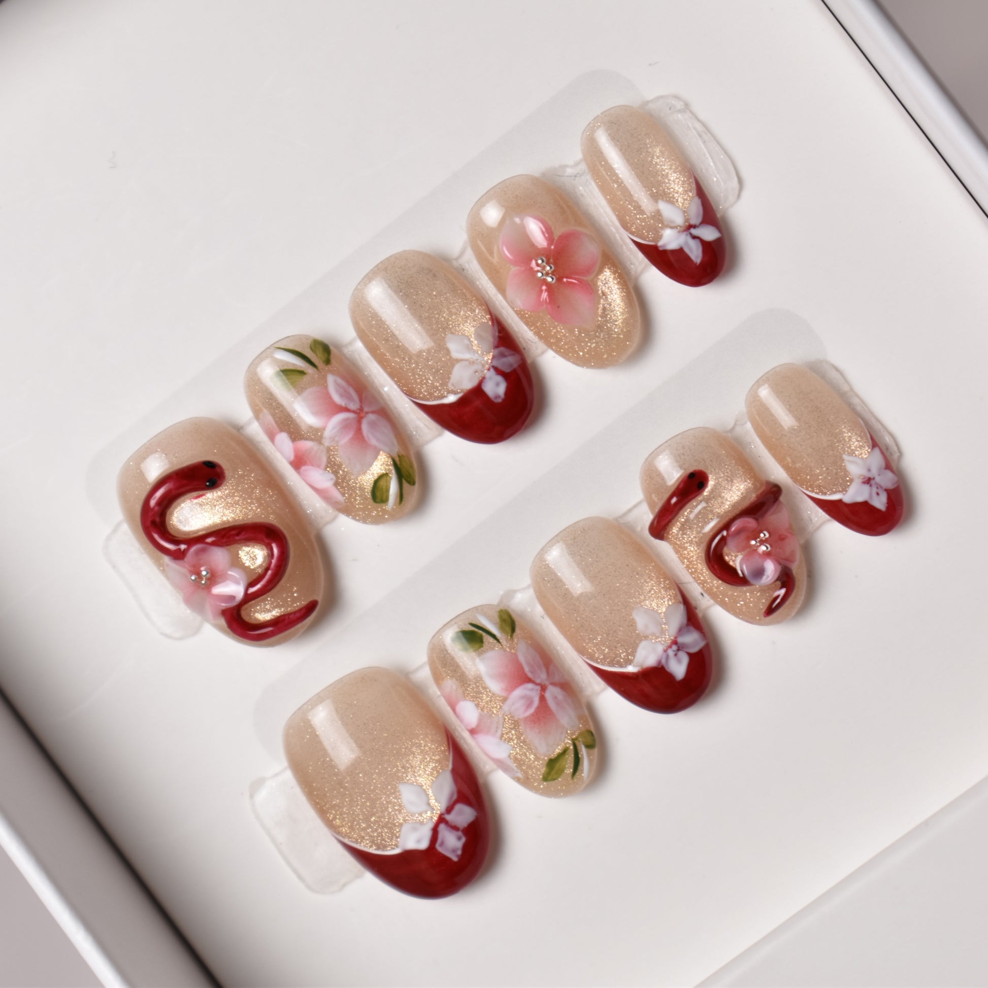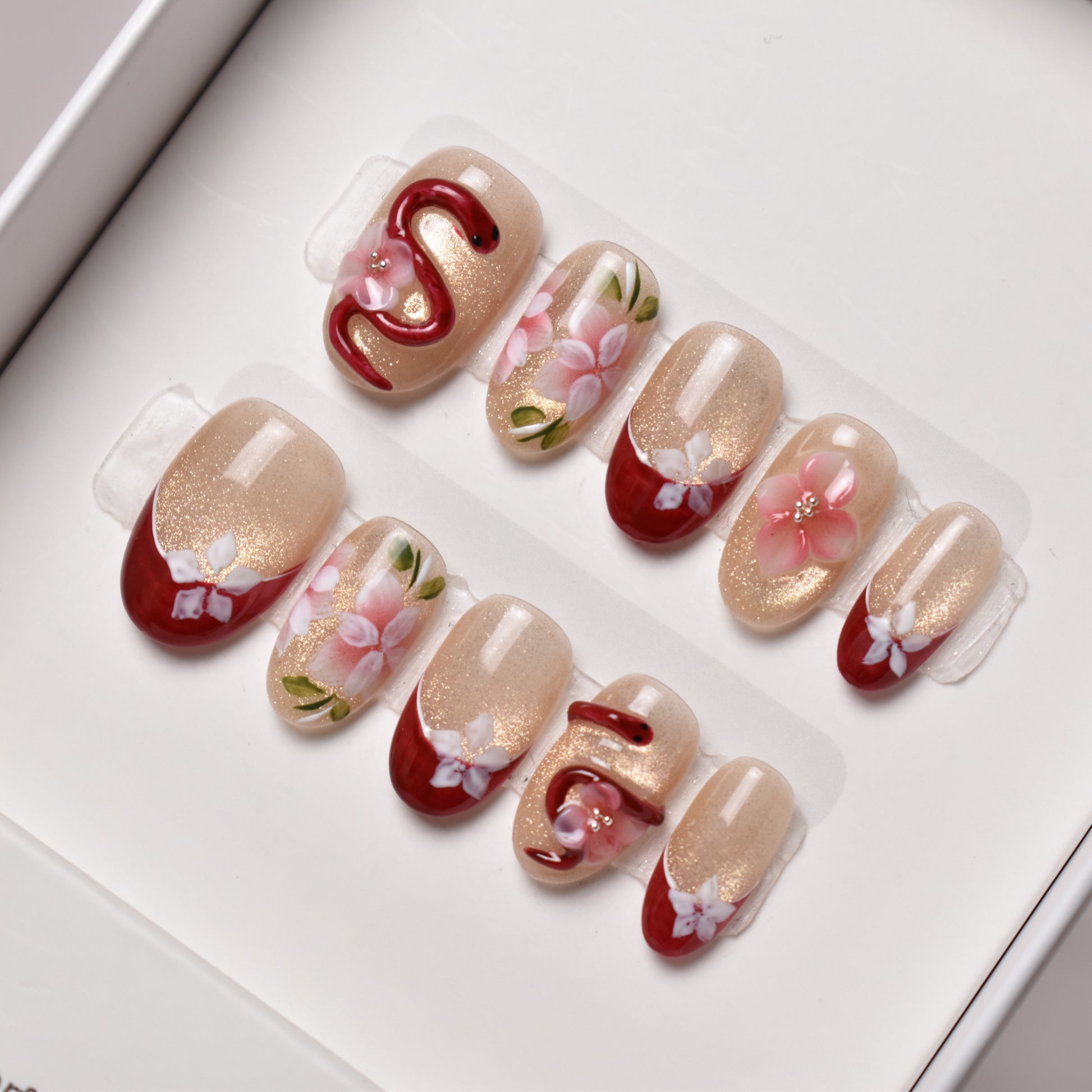 - 10 uniquely designed, hand-painted press-on nails made with high-quality UV gel.