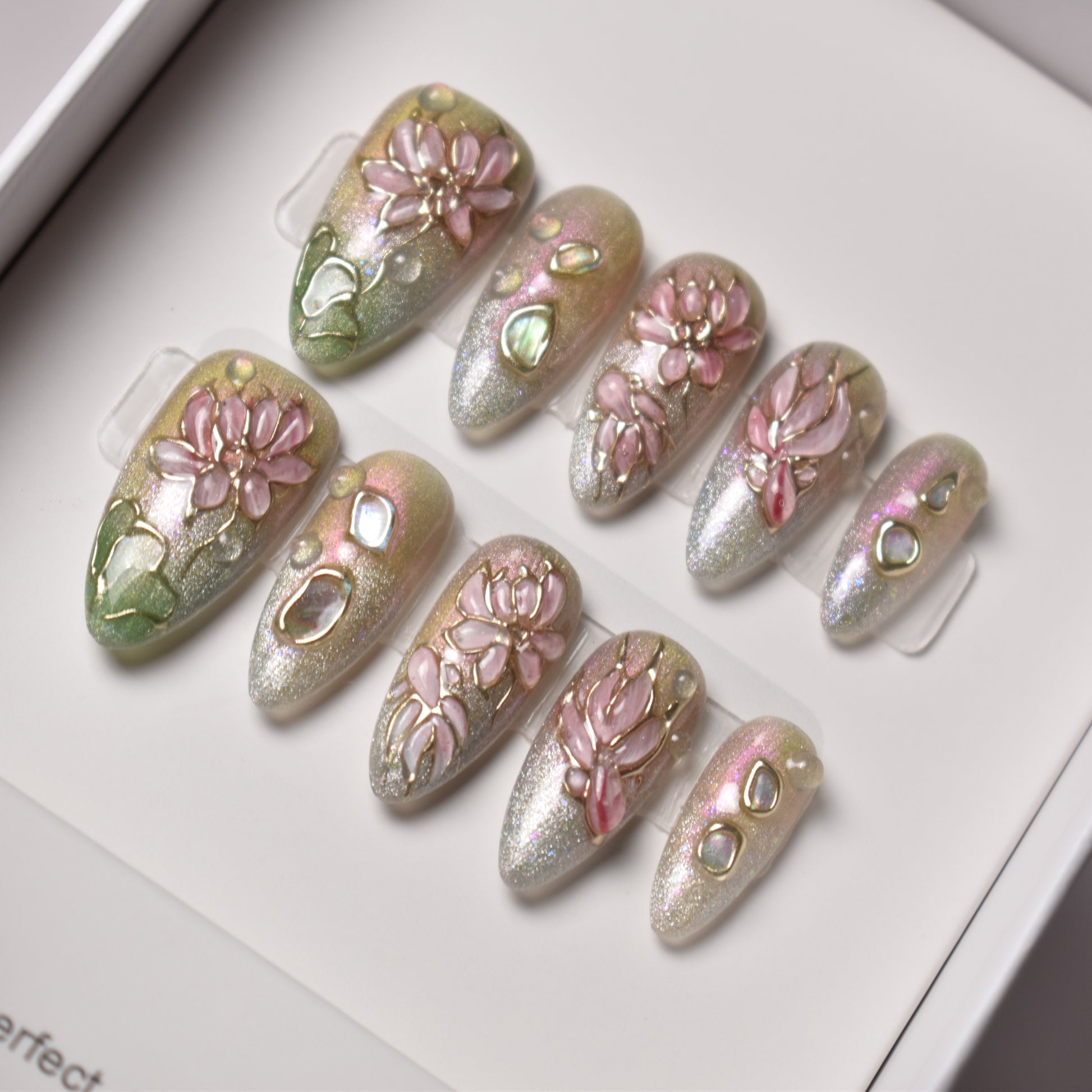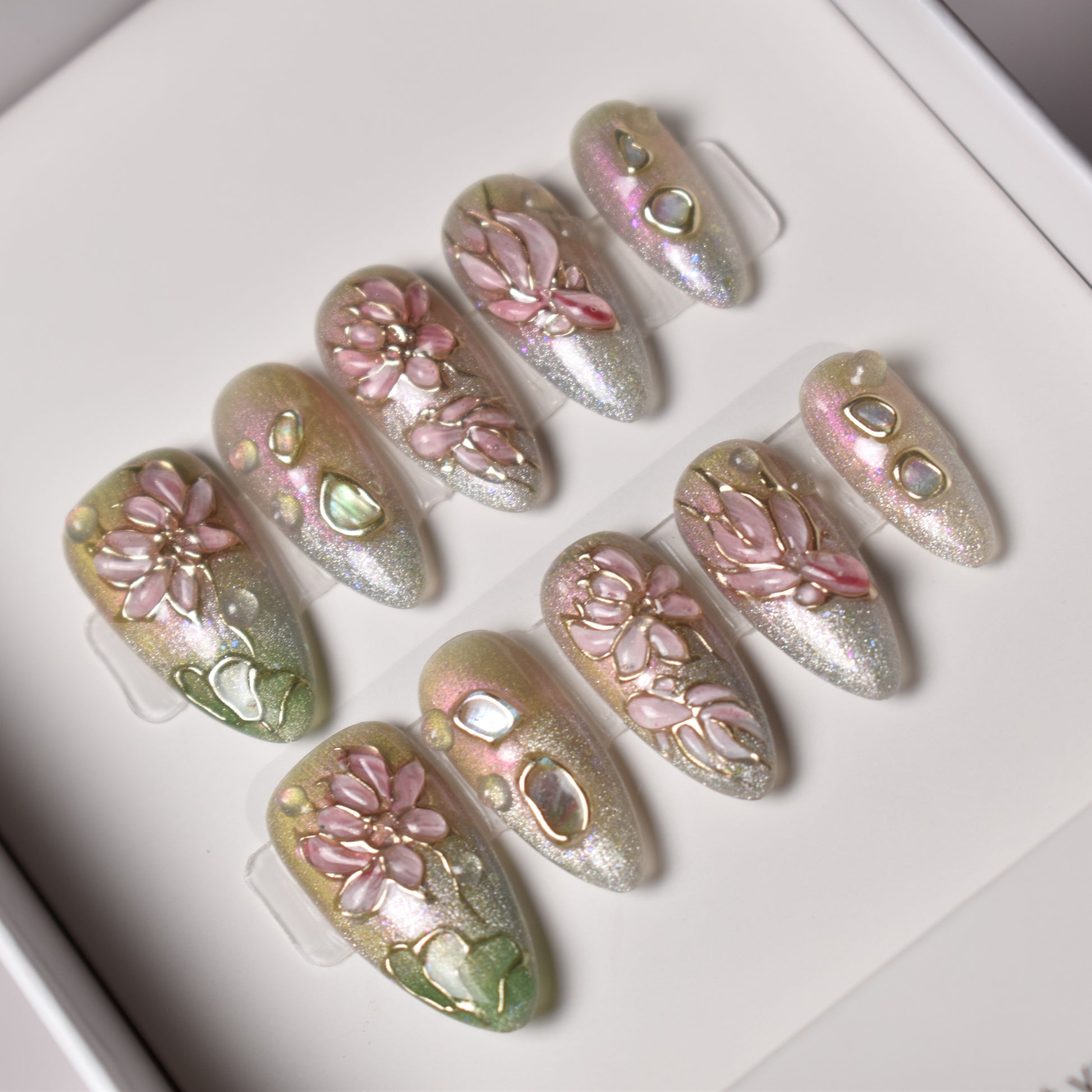 Translucent waters ripple in shifting iridescent tones, carrying pearl-pink lotus blooms edged with gold. Shell-like accents glisten along each curve, evoking treasures drawn from a sacred lake at first light. This design holds the stillness of dawn on a mythical shore, perfect for moments of contemplation and grace.