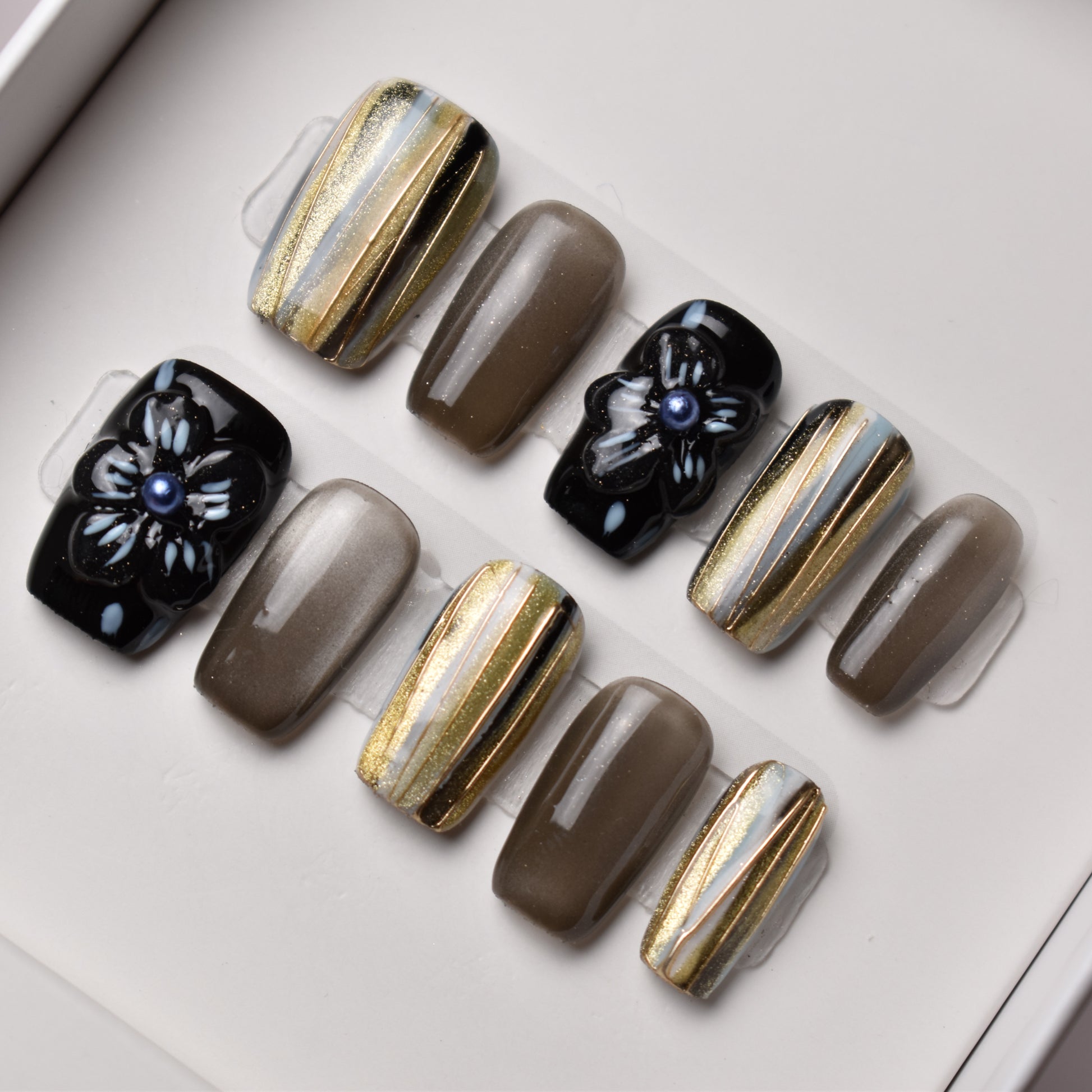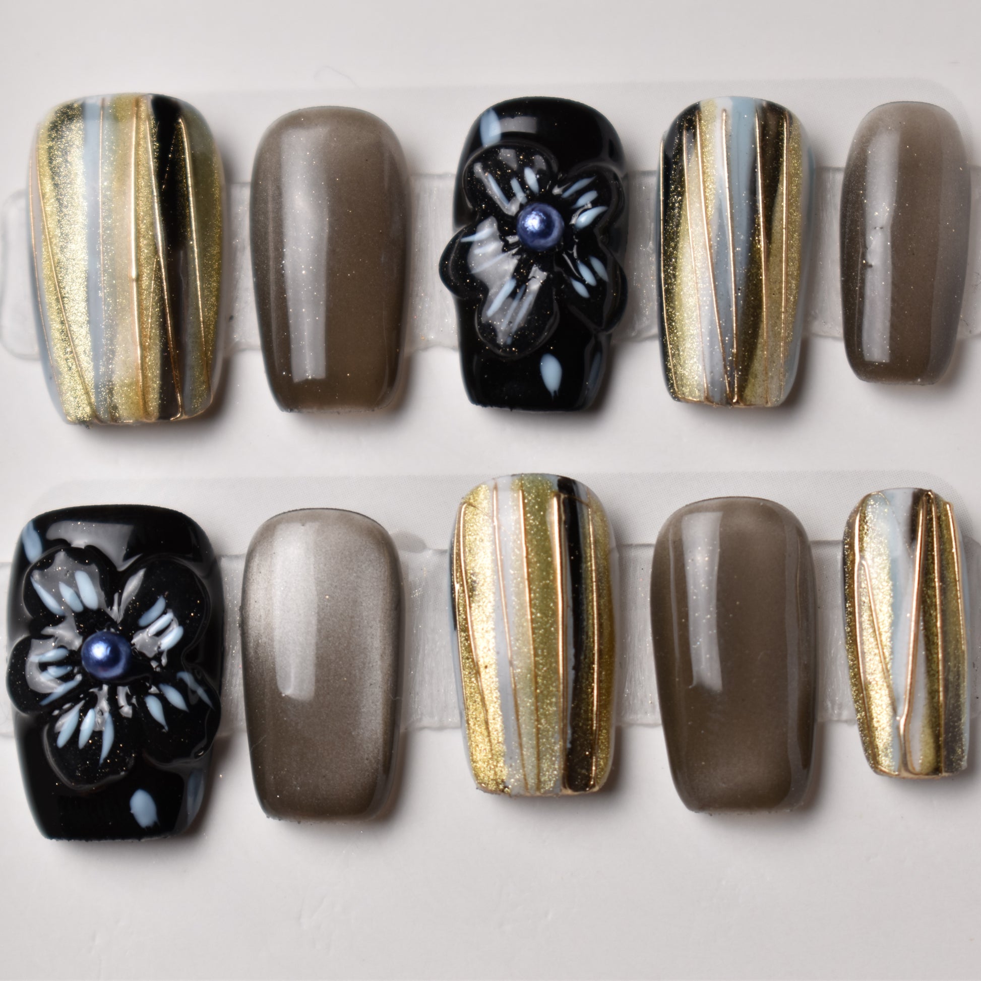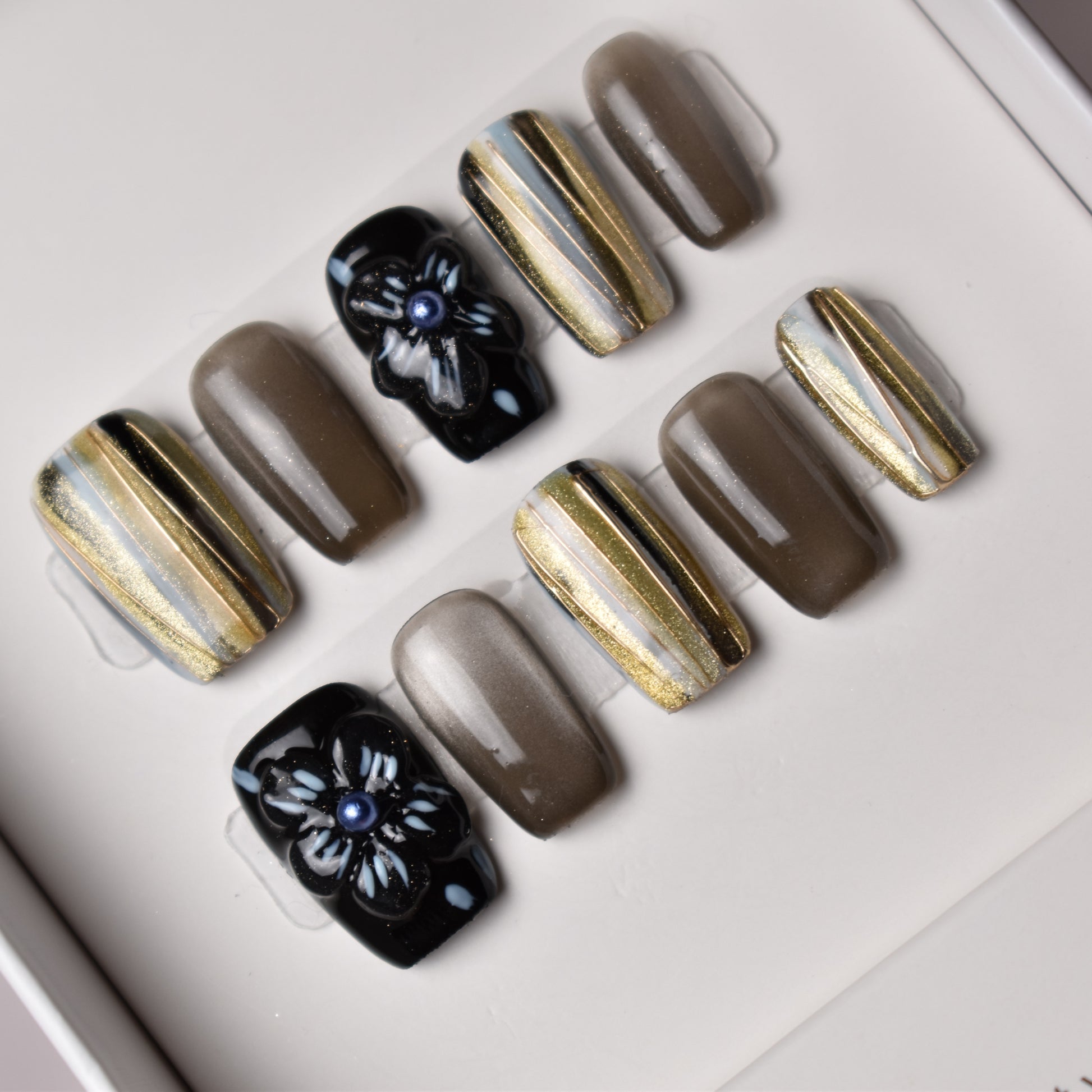 A sophisticated blend of champagne beige and black gel, with metallic gold striping that runs in fine vertical lines. Two statement nails feature hand-painted black flowers with blue pearl centers, accented with shimmering white details, resembling embroidery stitched with gold threads.