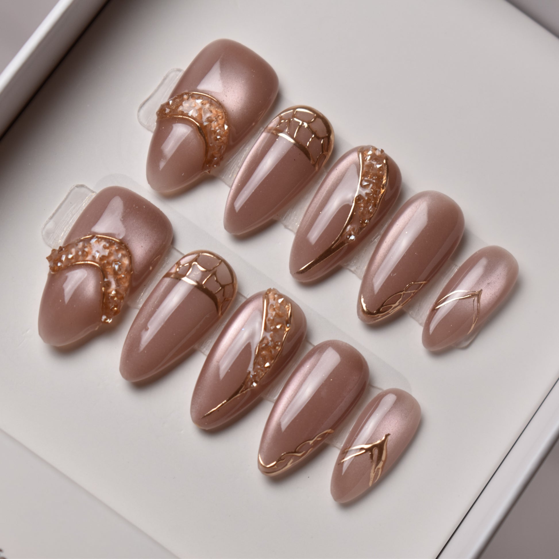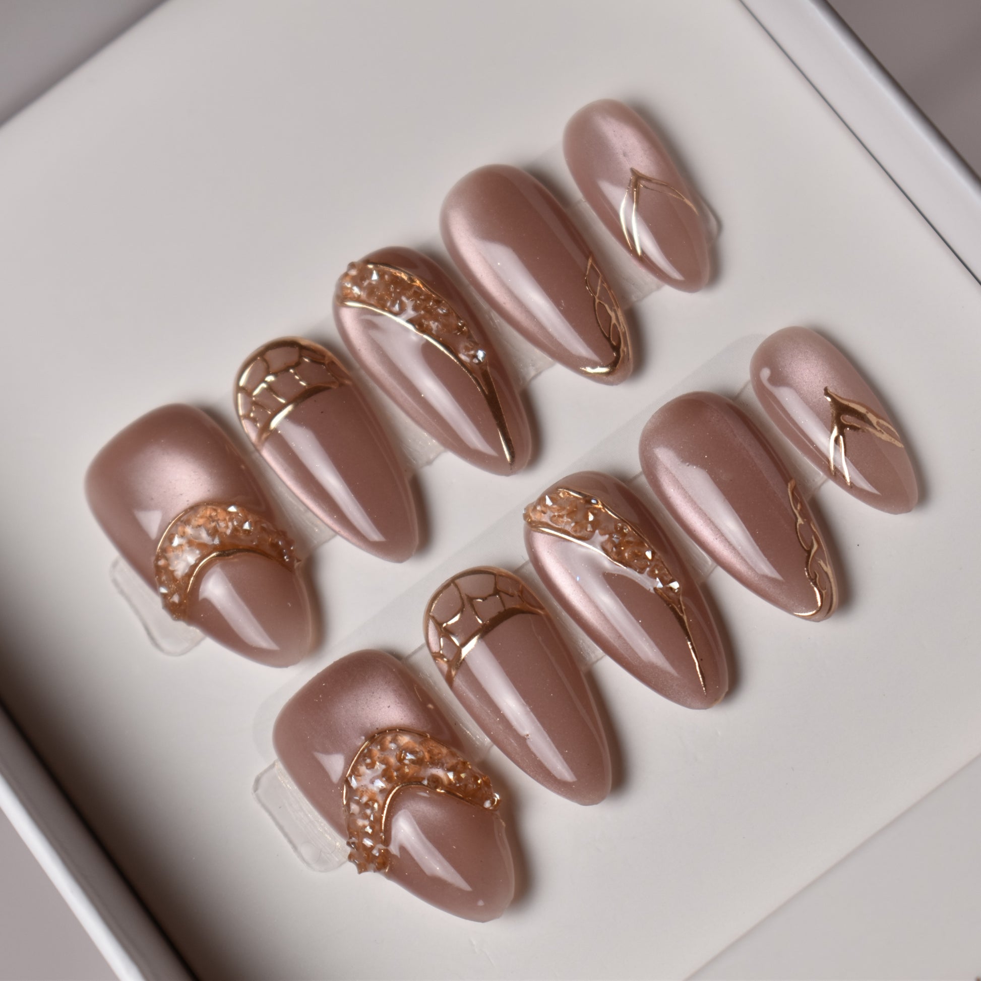 Smooth satin mocha tones stretch across the nails like fine silk, overlaid with molten gold textures that flow like liquid sunlight. Fine geometric lines balance the organic shimmer, lending the set a modern architectural edge. This design carries the understated power of gold — luxurious without being loud, perfect for both high-fashion statements and subtle everyday sophistication.