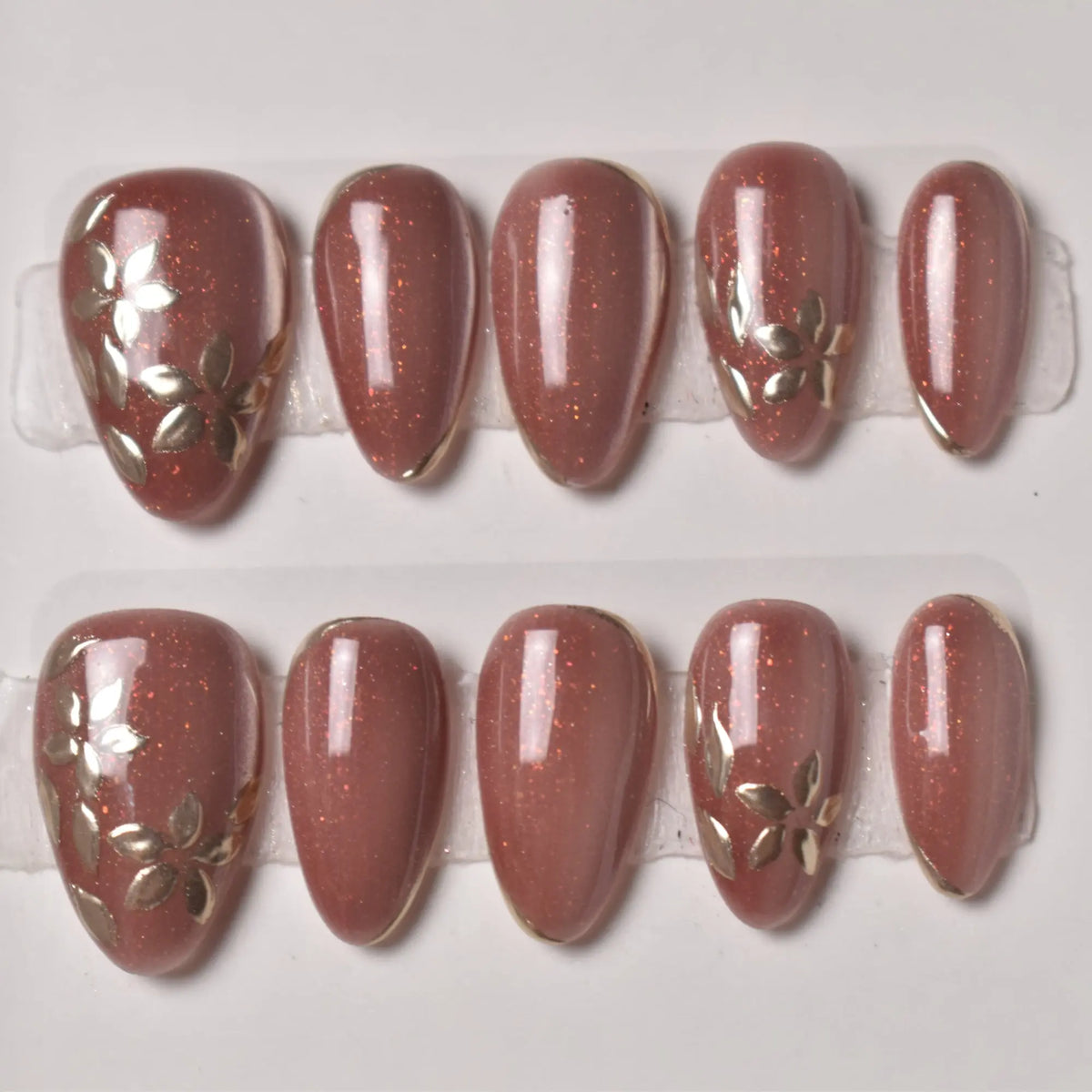 - 10 uniquely designed, hand-painted press-on nails made with high-quality UV gel.