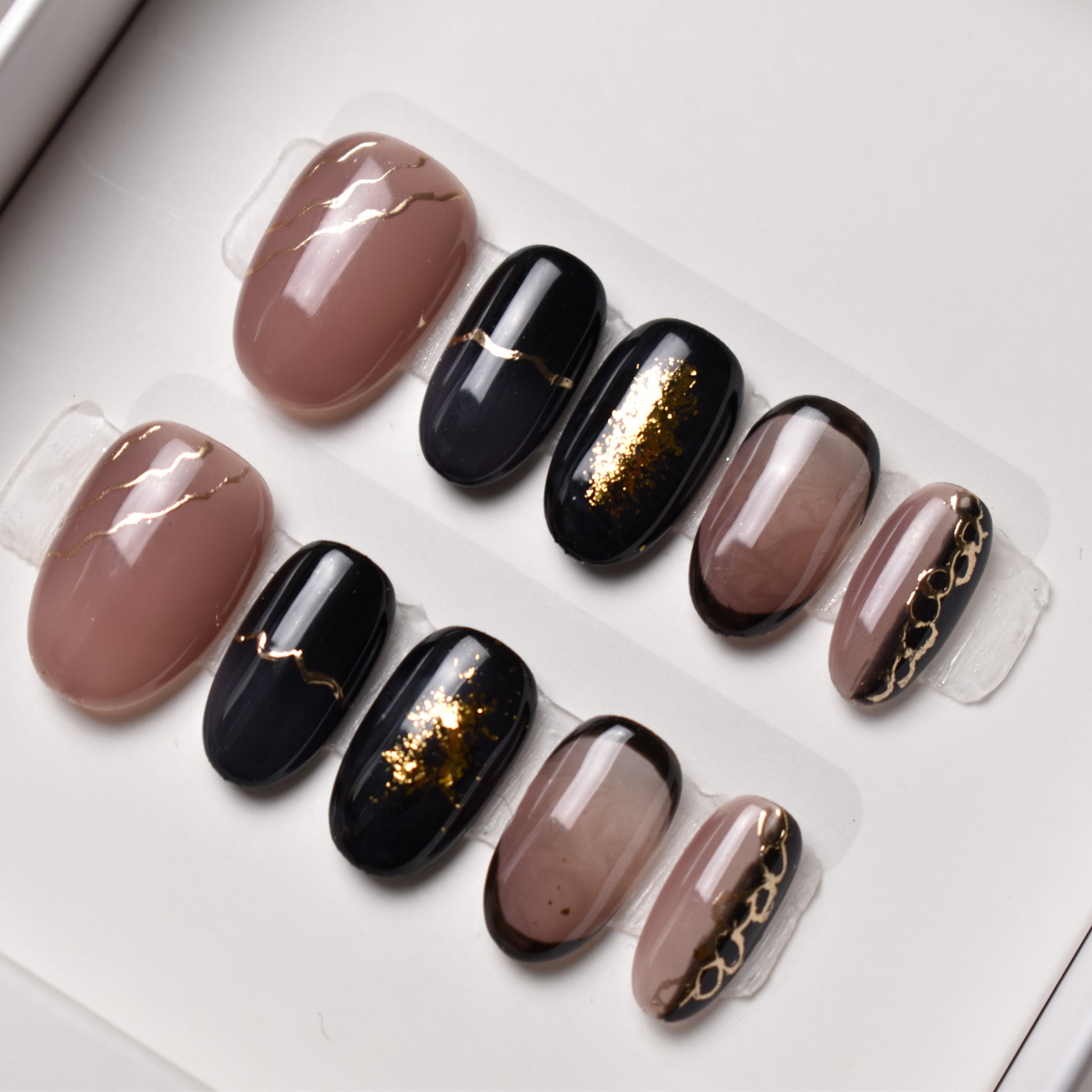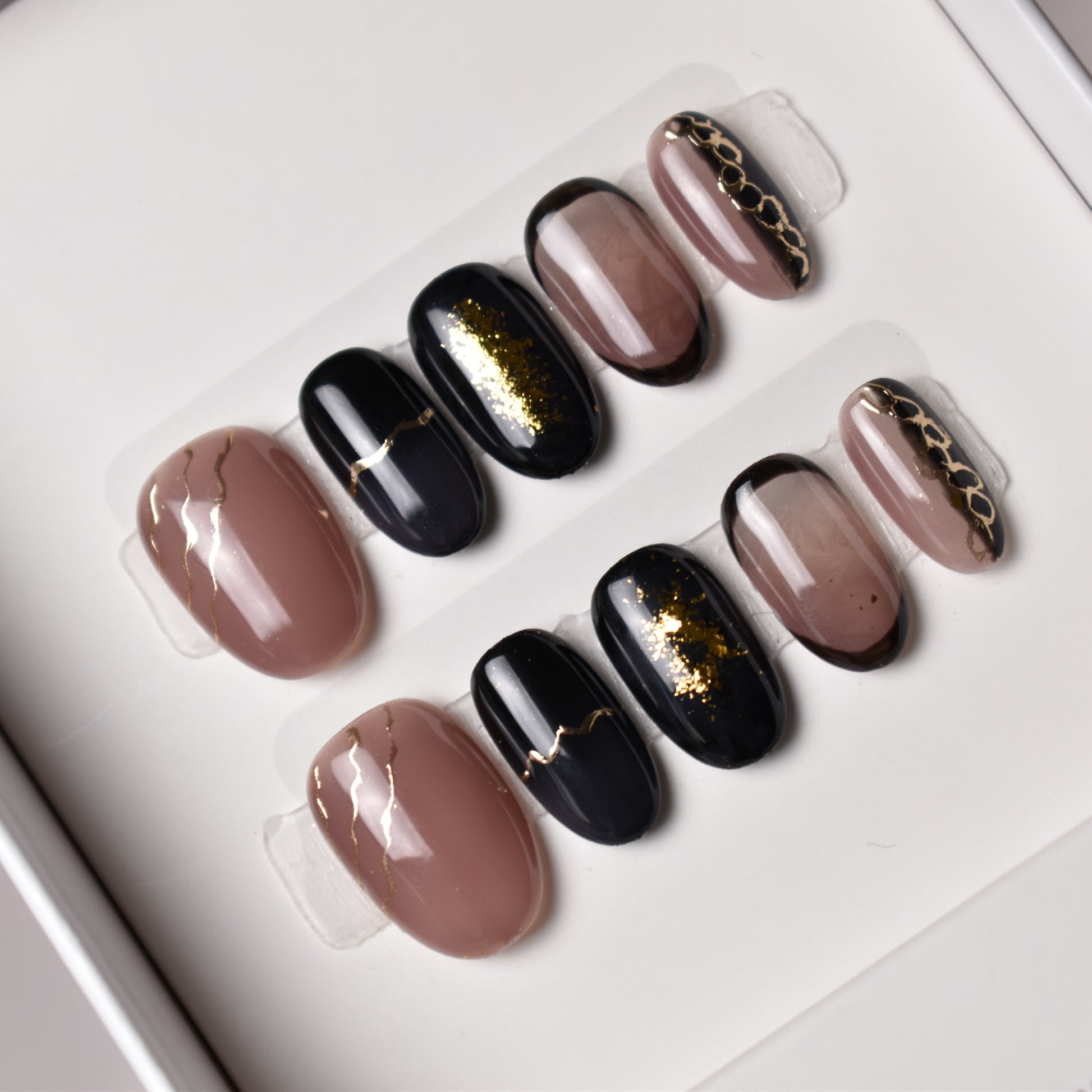 A graceful fusion of jet-black gloss and soft mocha is elevated by strokes of molten gold, like moonlight gilding the edges of night. Gold leaf accents and delicate chain motifs bring a regal touch, while the interplay of dark and light exudes quiet power. Ideal for moments that call for refinement.