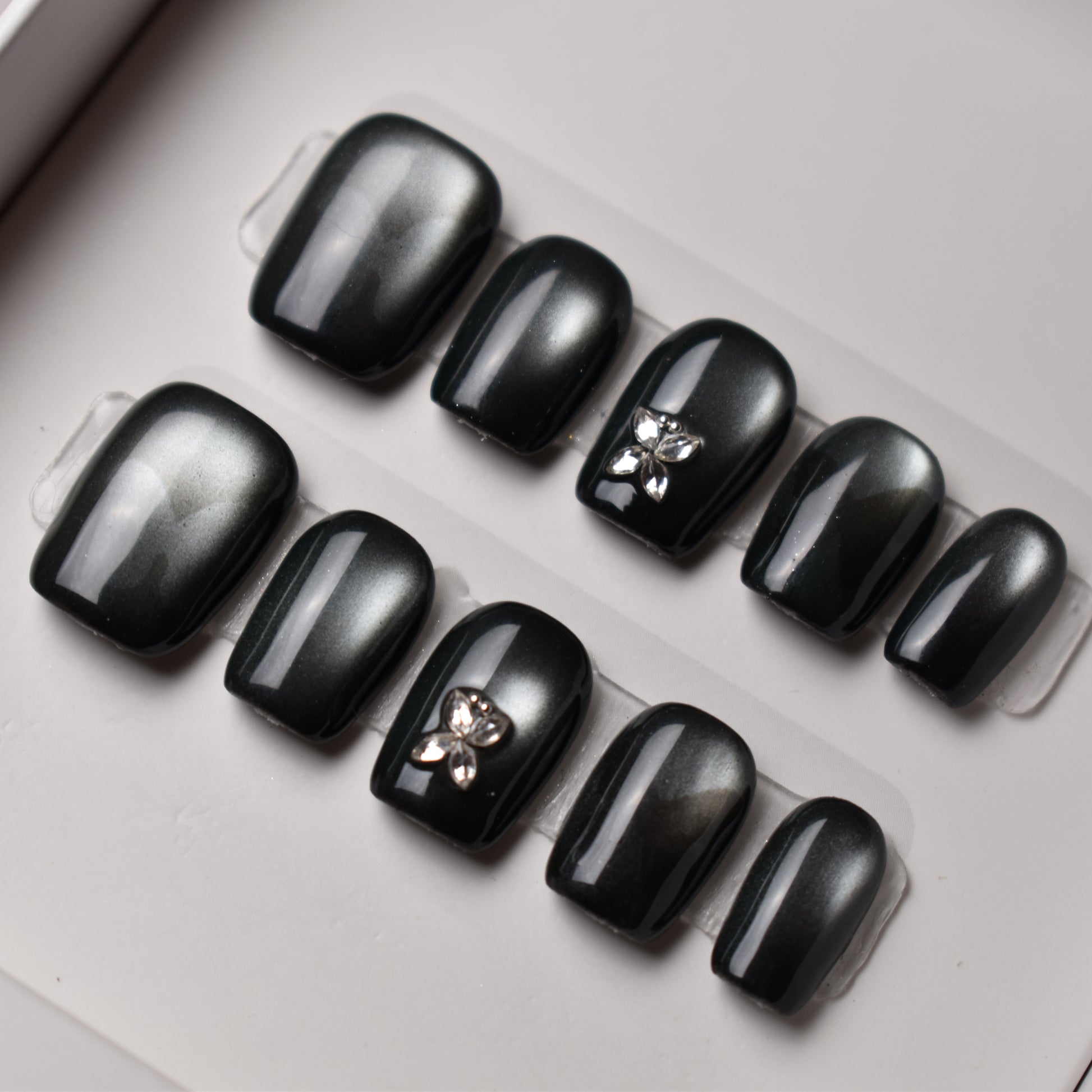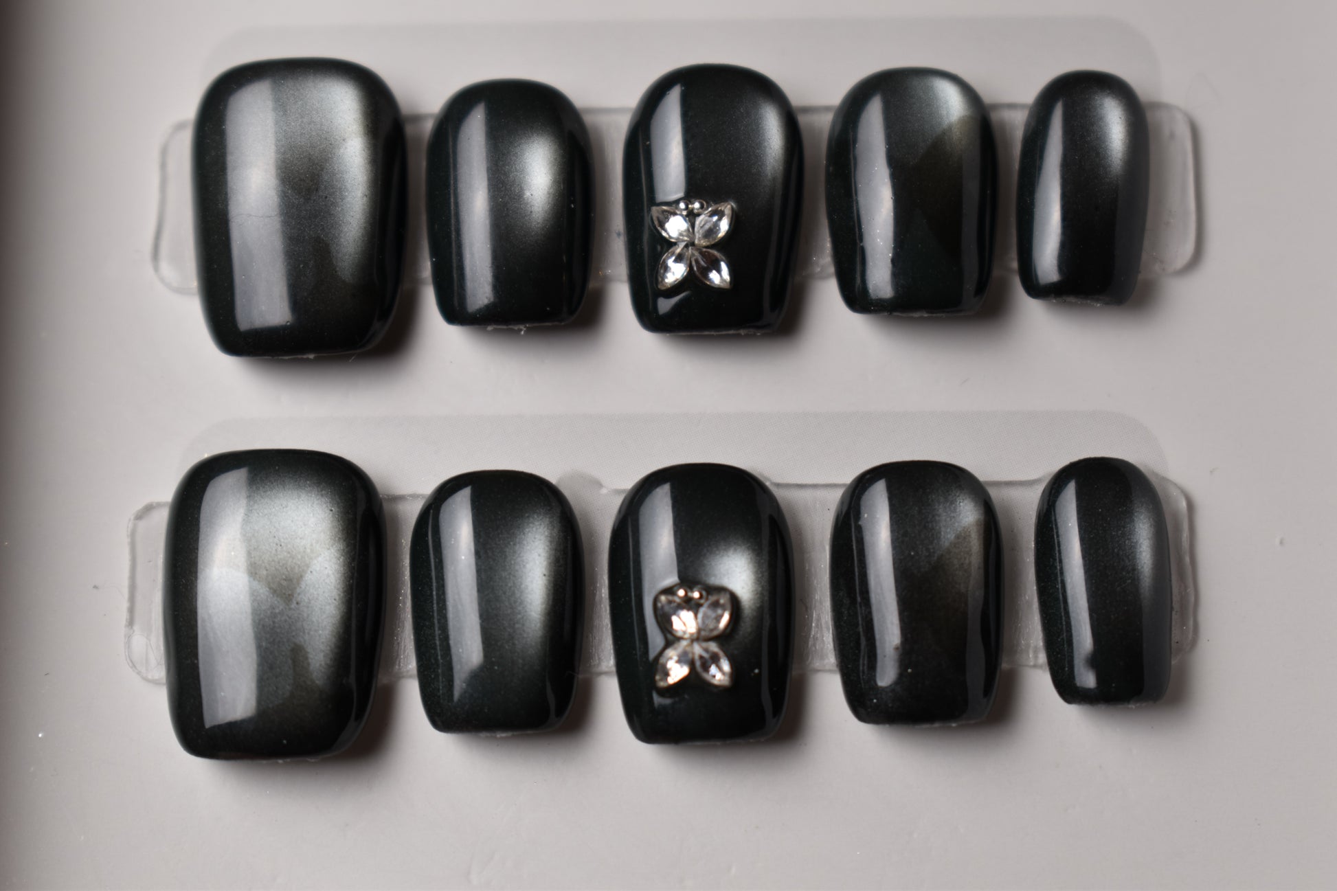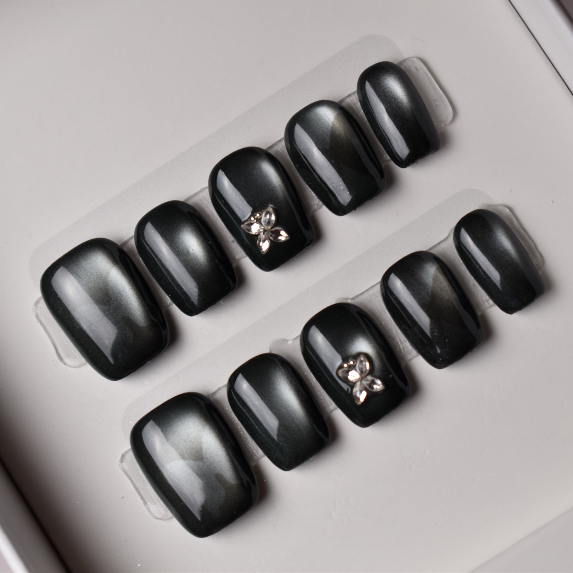 A mysterious deep-charcoal cat-eye gel base shimmers under shifting silver light, creating a moody, moonlit glow. Each nail reflects a galaxy-like depth with subtle magnetic highlights that catch the eye at every angle. Two accent nails feature delicate, crystal-studded floral charms, adding a quiet elegance reminiscent of a single blossom blooming under the midnight sky. This set blends minimalism with refined luxury, perfect for those who want their nails to whisper sophistication rather than shout.