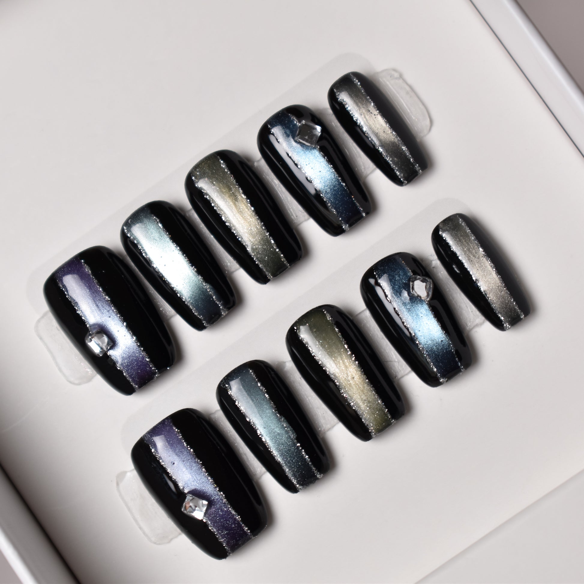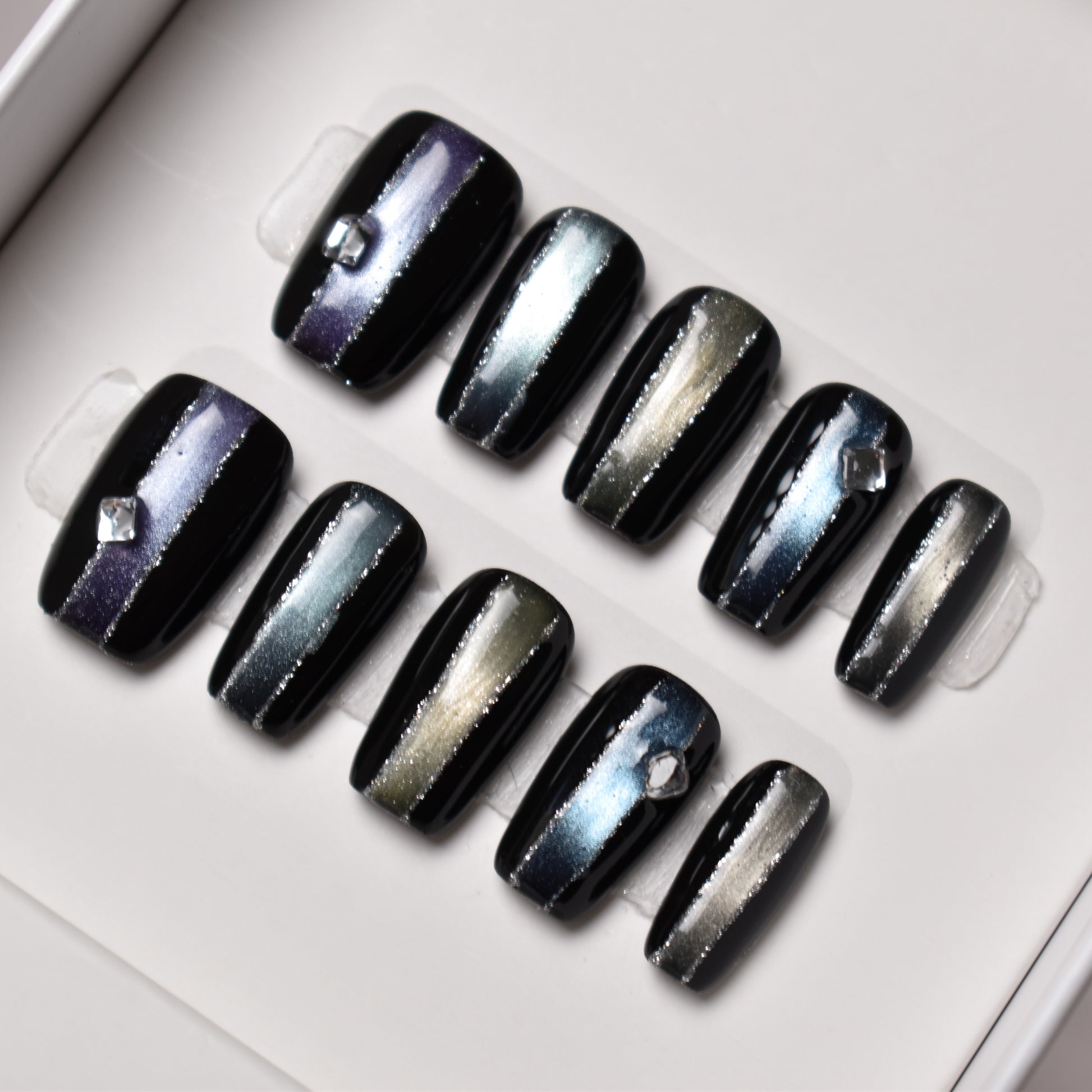Inky black lacquer reveals magnetic aurora bands shifting from indigo to pewter and olive, accented by a single crystal for a sleek, cosmic finish.