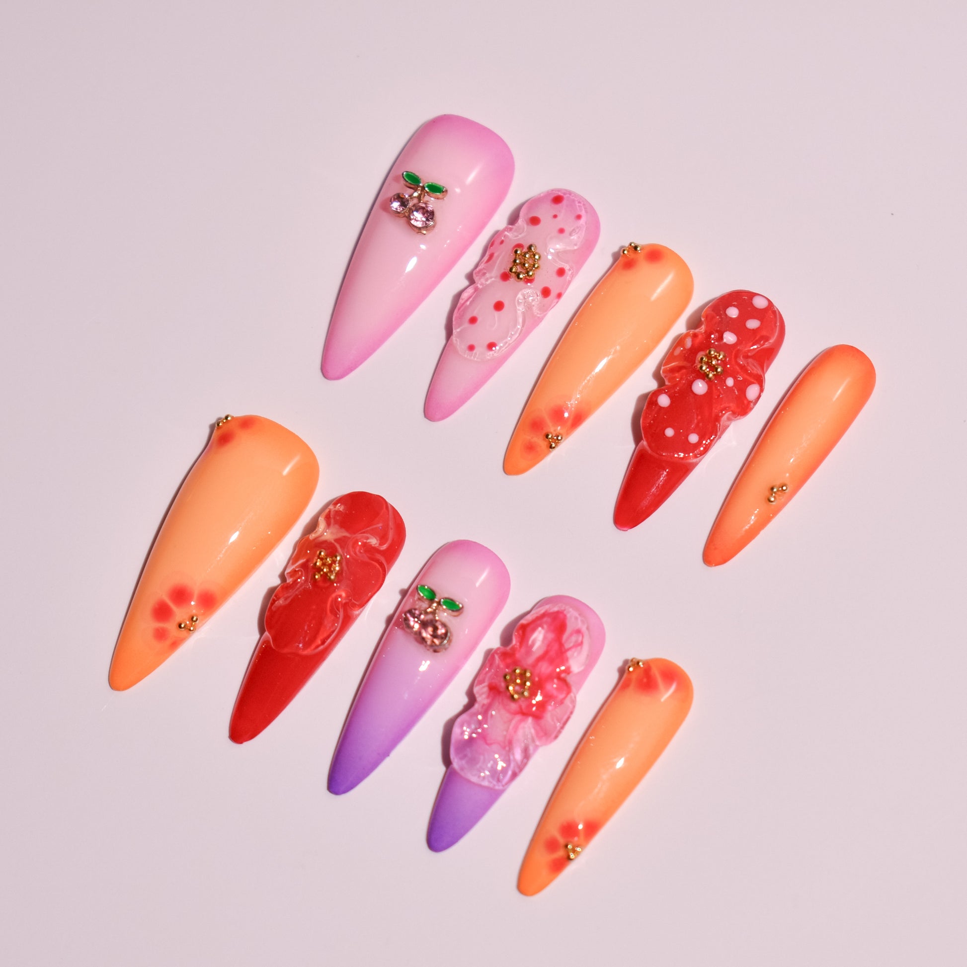 Momoiro Mikan (桃色蜜柑) is a bold long stiletto press-on nail set inspired by juicy summer fruits and glossy jelly florals. Featuring a vibrant blend of pink, coral, tangerine orange, and cherry red, this design feels playful, flirty, and irresistibly sweet.