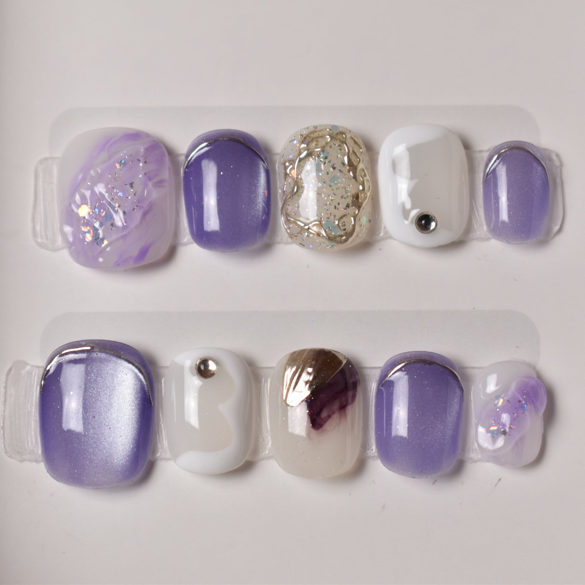 Gentle lavender gradients meet pearlescent whites, accented with iridescent glitters and marbled swirls. Like twilight skies laced with clouds, this dreamy design is perfect for serene elegance.