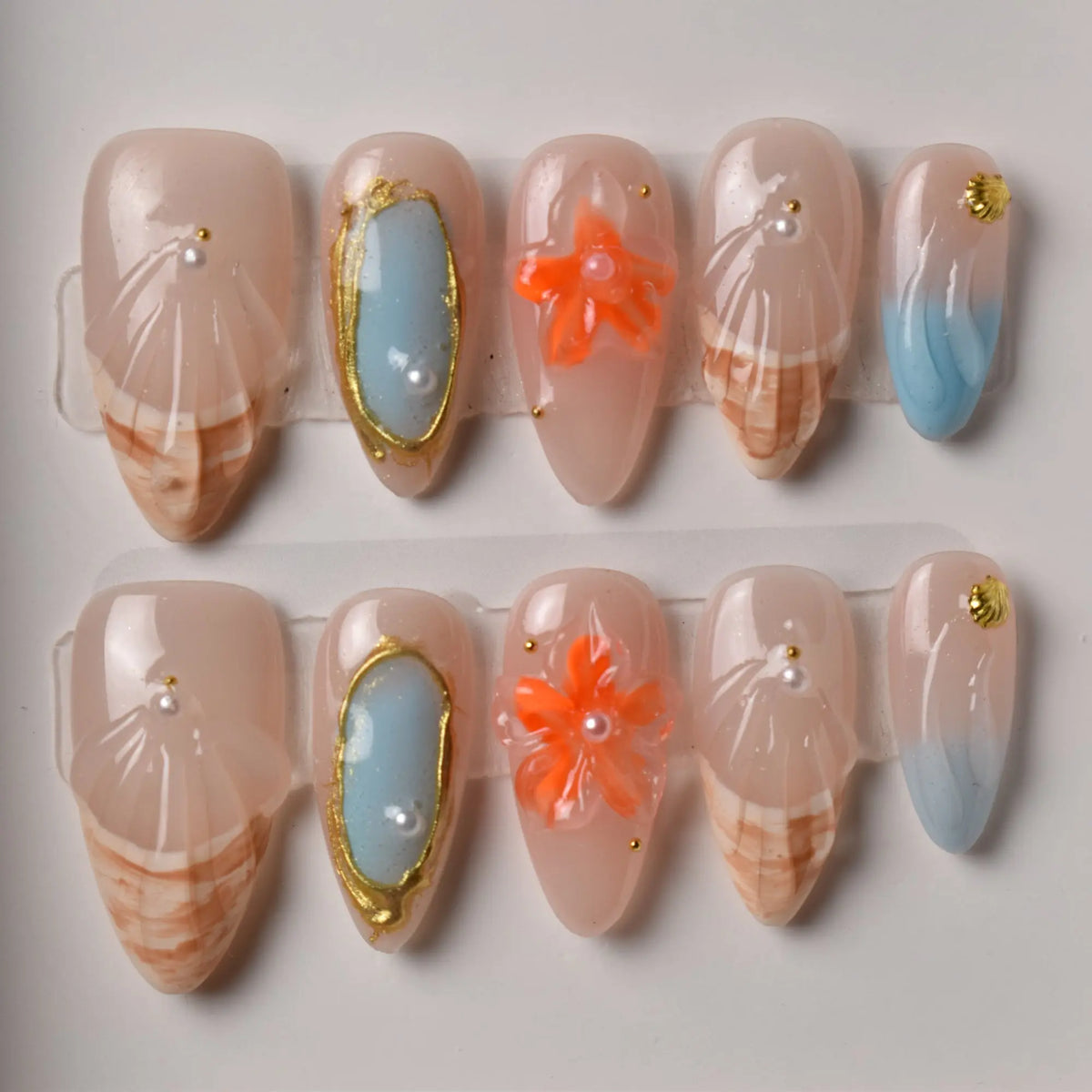 A breezy mix of seashell textures, coral-orange 3D flowers, and sky-blue accents brings this set to life. Nude bases with sandy gradients evoke warm shores, while golden frames and pearl embellishments add a hint of luxury. Perfect for beach vacations, tropical escapes, and summer festivals under the sun.