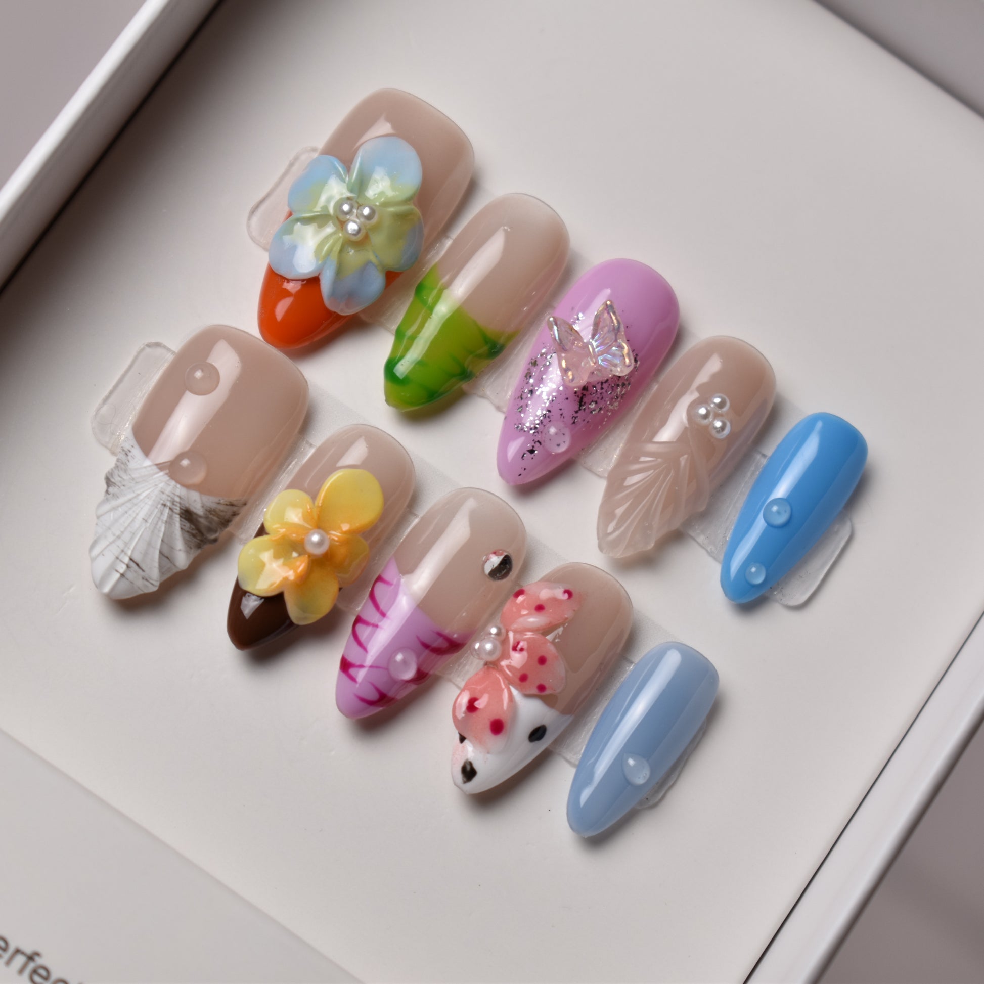 A playful burst of color and whimsy, this vibrant set celebrates the joy of summer with an eclectic mix of 3D flowers, fluttering bows, and seashell motifs. From the citrus-green tips to the sky-blue accents, each nail tells a different story of sunny days, ocean breezes, and carefree laughter. Perfect for vacations, beachside parties, and embracing the season’s spirited charm.