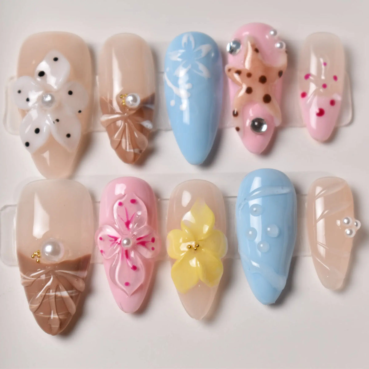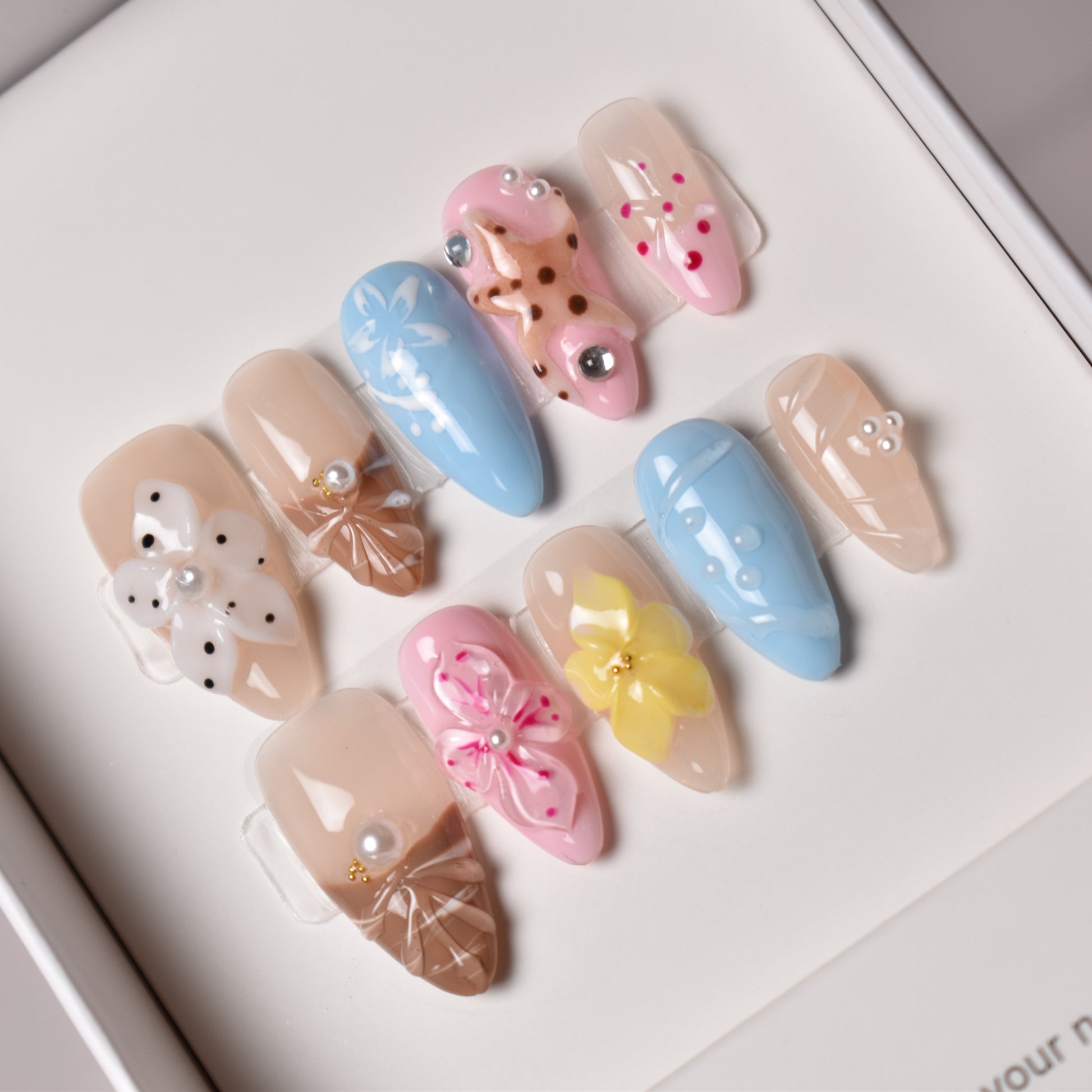 A playful festival unfolds across these pastel nails, where blue, pink, yellow, and cocoa hues meet candy-like pearls and sculpted blossoms. Each detail sparkles with the joy of sunlit fairgrounds, the sweetness of shared treats, and the carefree laughter of summer afternoons.