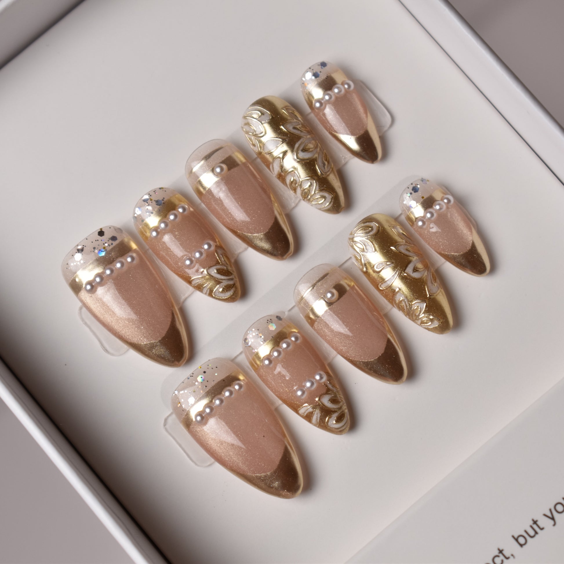 Luxe gold tips grace a nude base, adorned with pearl accents and intricate gilded scrolls. The balance of minimal elegance and ornate detail recalls treasures from a royal garden. Perfect for formal banquets and timeless style lovers.