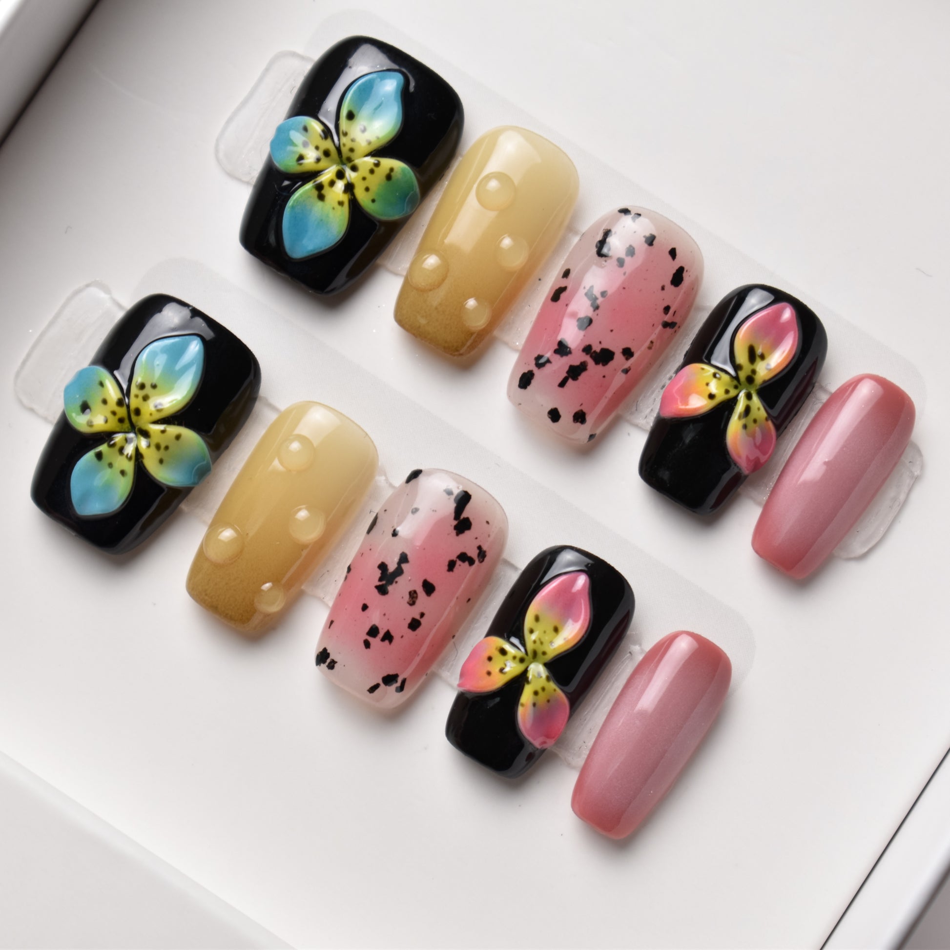 Vibrant orchids unfurl across glossy black, blush, and honey tones, each petal a burst of exotic beauty. Playful speckles and subtle gloss accents create a lively, modern charm. Ideal for tropical escapes, artistic gatherings, and moments when vibrance meets sophistication.