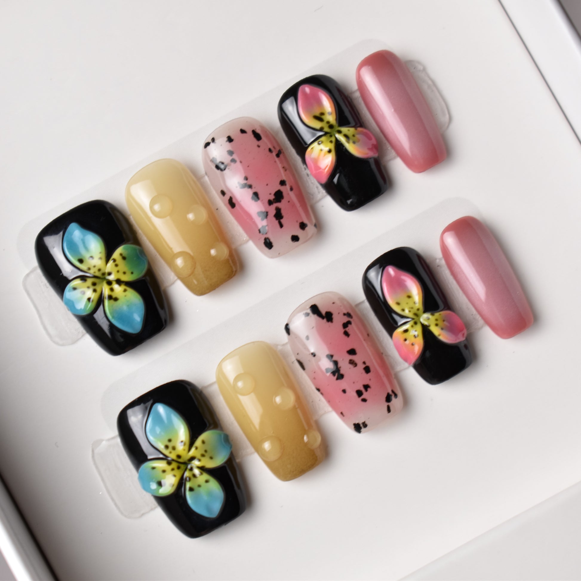 Vibrant orchids unfurl across glossy black, blush, and honey tones, each petal a burst of exotic beauty. Playful speckles and subtle gloss accents create a lively, modern charm. Ideal for tropical escapes, artistic gatherings, and moments when vibrance meets sophistication.