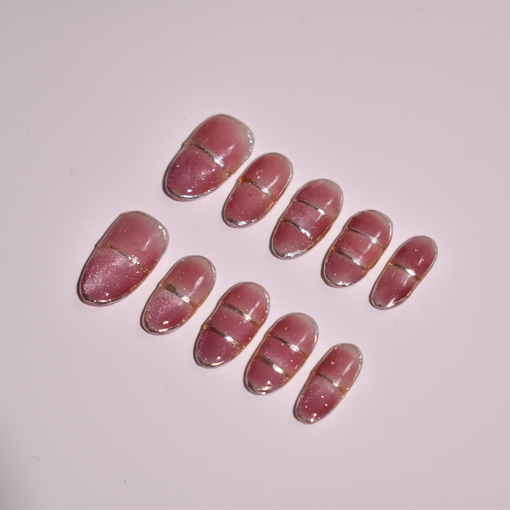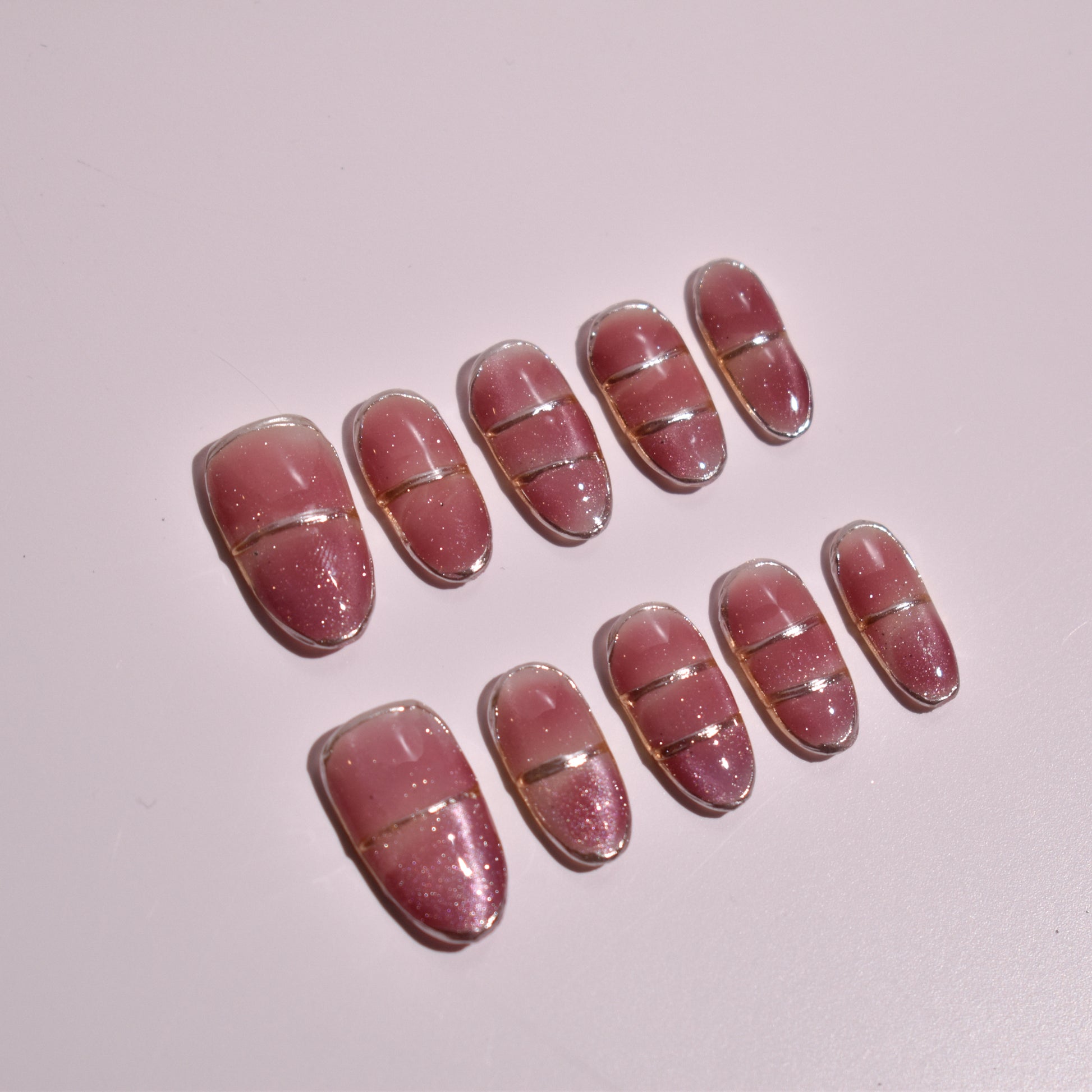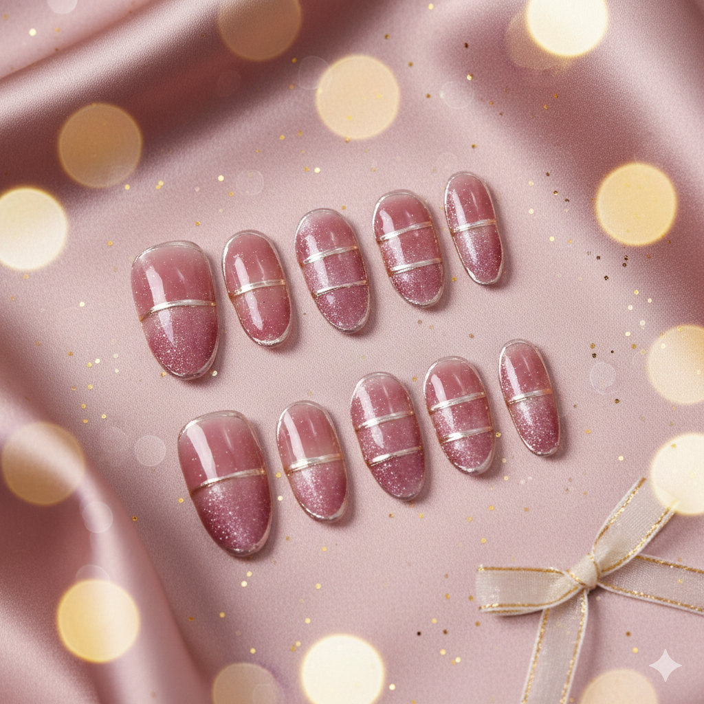 Each nail is defined by precise metallic line detailing, hand-applied in fine silver and soft gold tones to create clean horizontal divisions across the nail surface. Select nails showcase subtle shimmer gradients, where fine glitter is softly blended into the rose base for depth and light-catching dimension, while others remain glossy and minimal for balance. The design relies on precision painting and layered gel application, resulting in a sleek, architectural look with understated luxury.