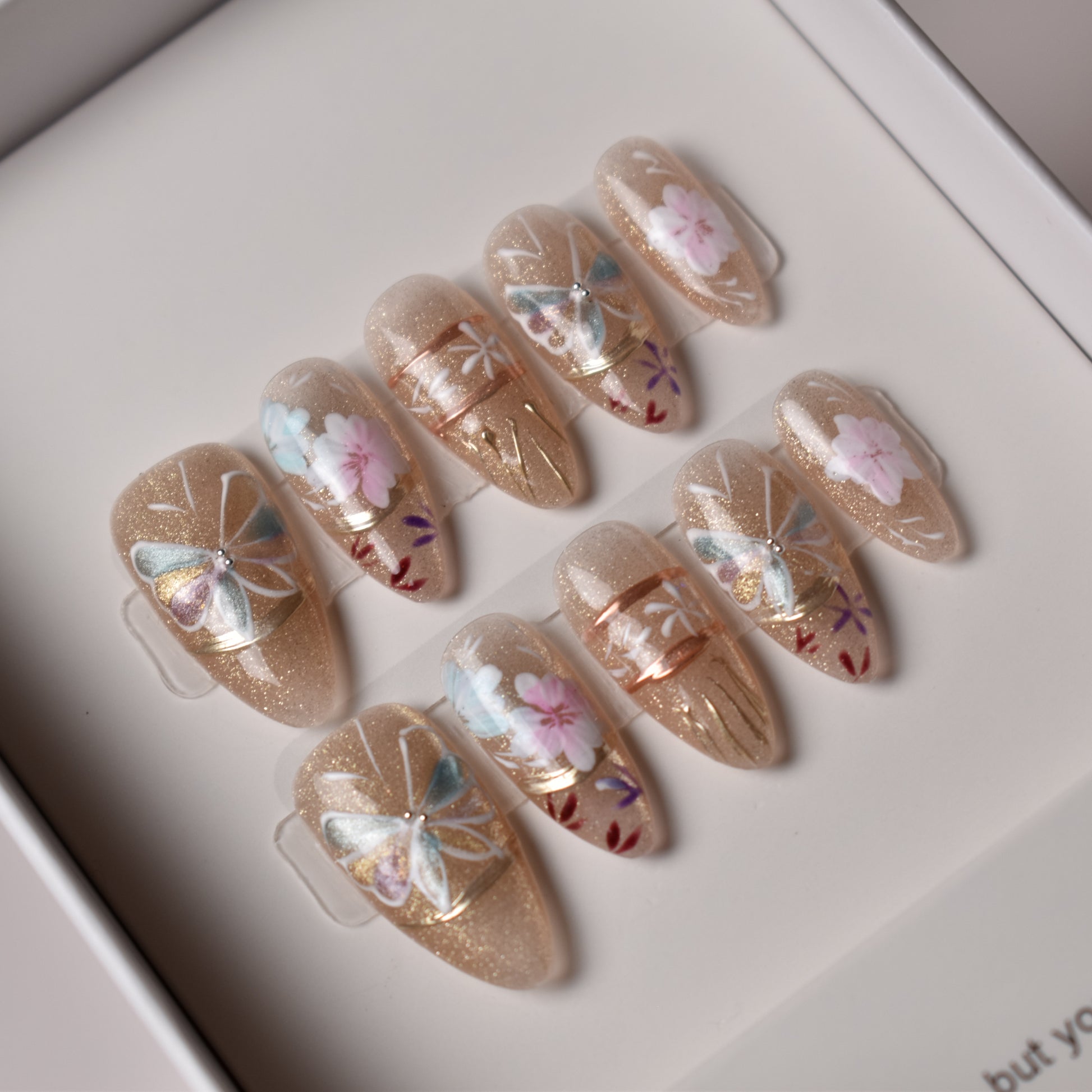 - 10 uniquely designed, hand-painted press-on nails made with high-quality UV gel.