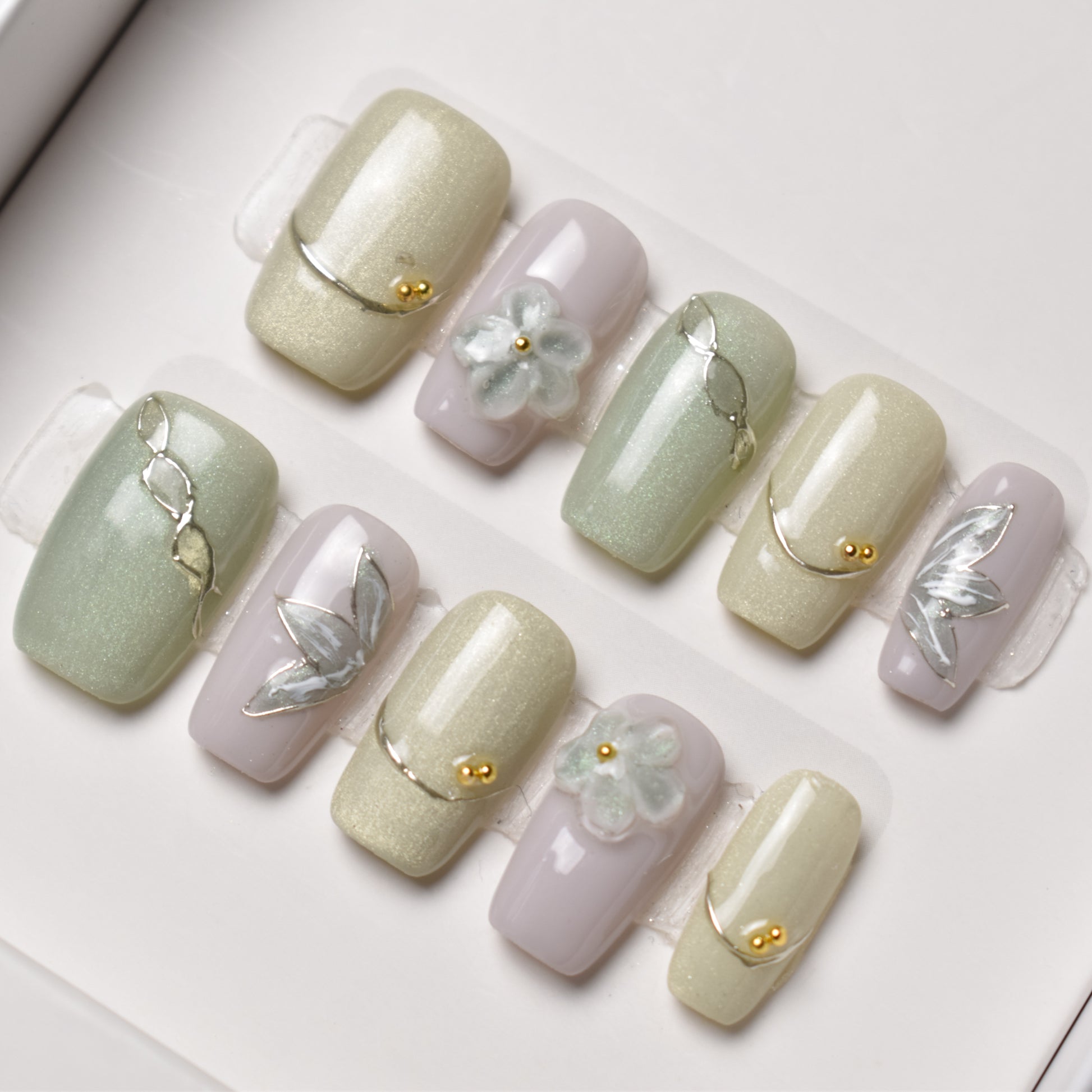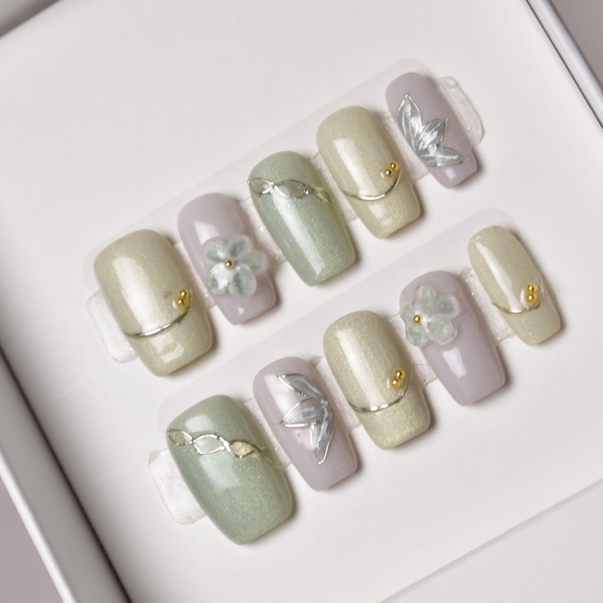 Misty sage and lilac shimmers are linked by silver vines, petite gold studs, and soft 3D blossoms, capturing the calm grace of early spring leaves and tea-ceremony serenity.