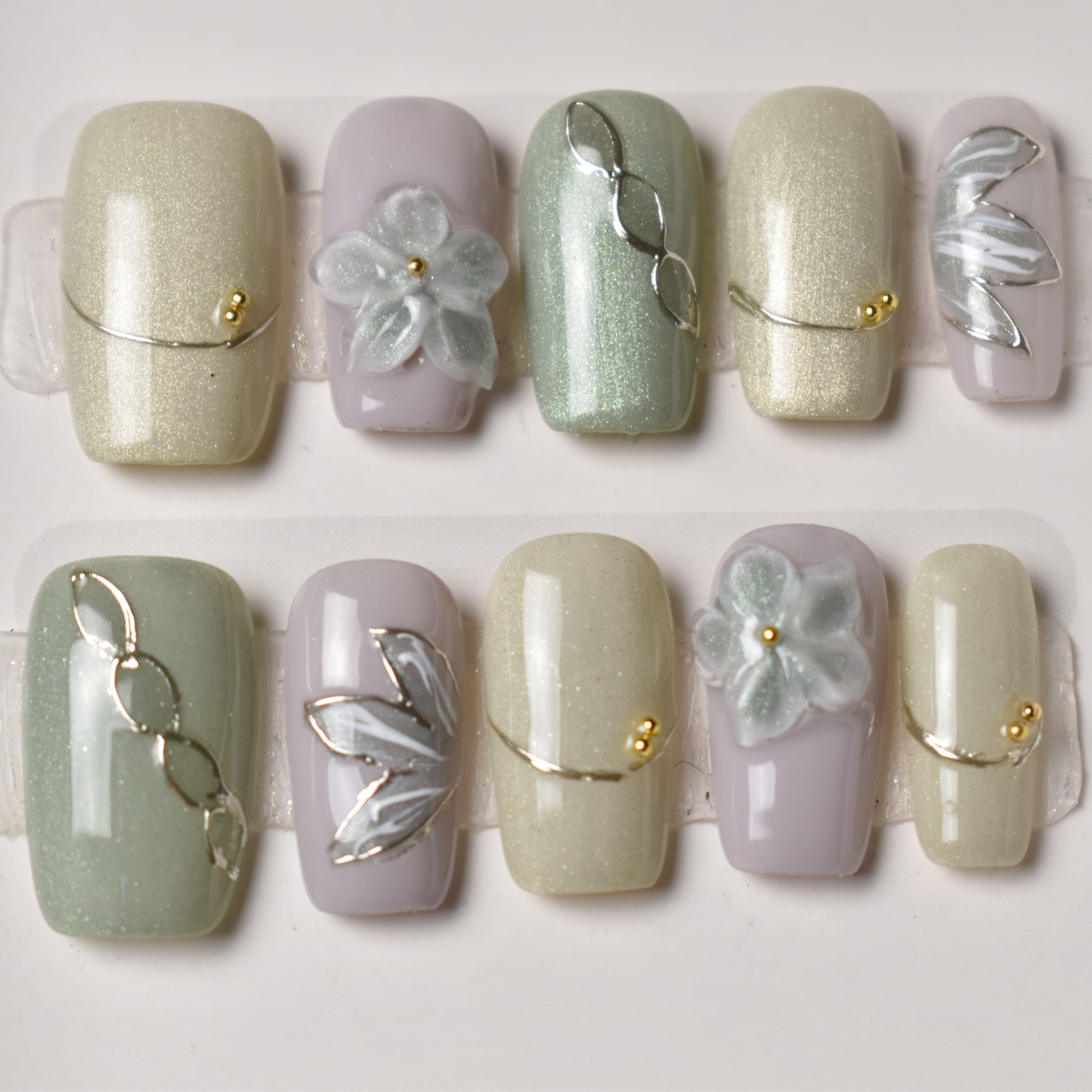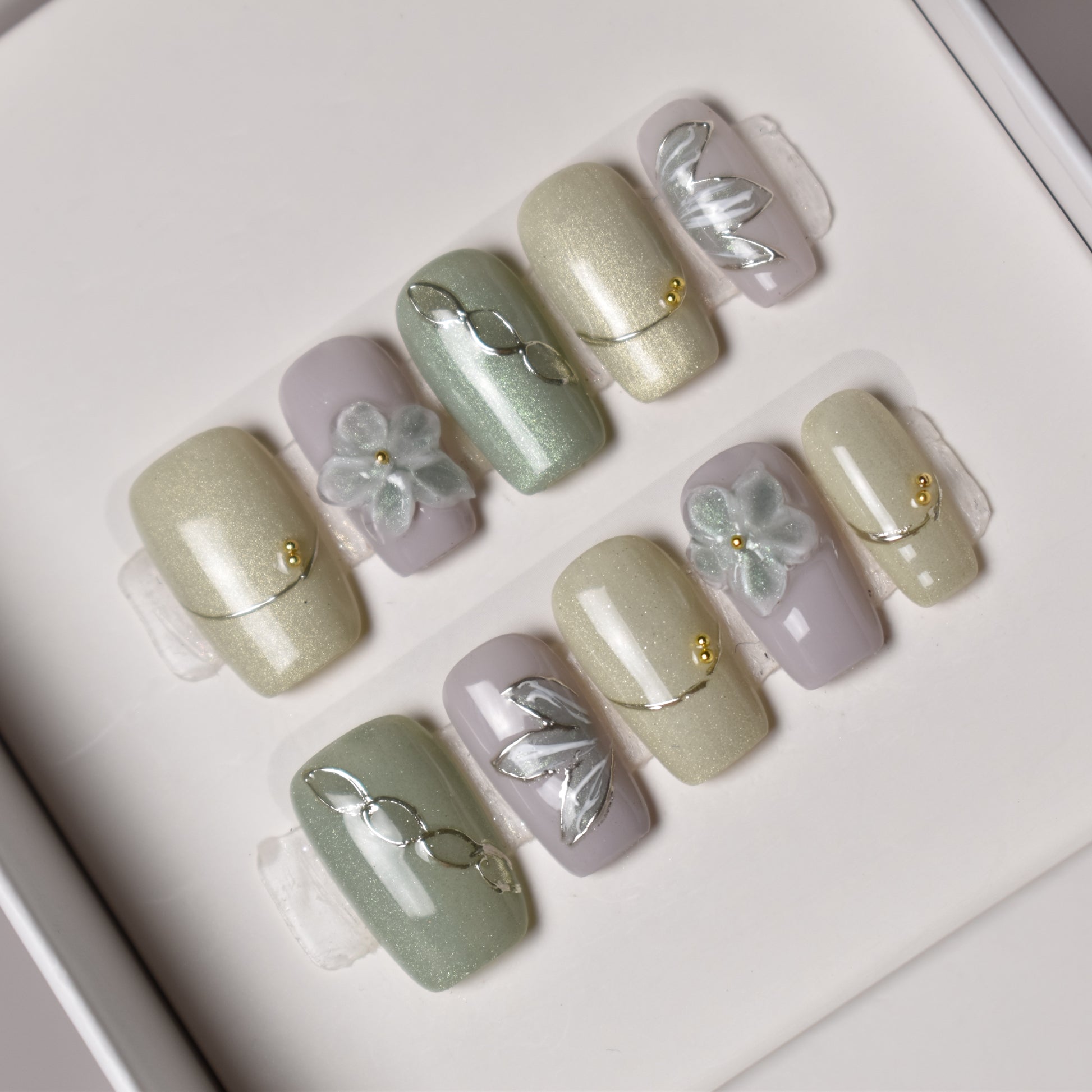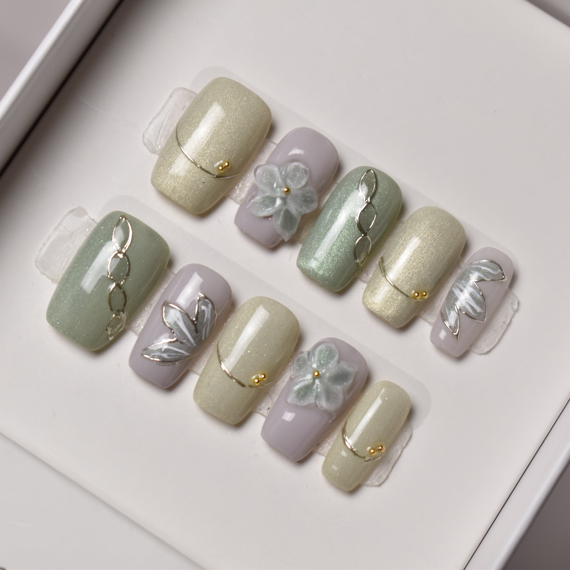 Gentle sage and lilac tones shimmer softly, bound together by silver vines and kissed with tiny gold studs. 3D blossoms bloom delicately, as if heralding the first buds of spring in a mossy garden. Perfect for tea ceremonies, slow mornings, and moments of renewal.