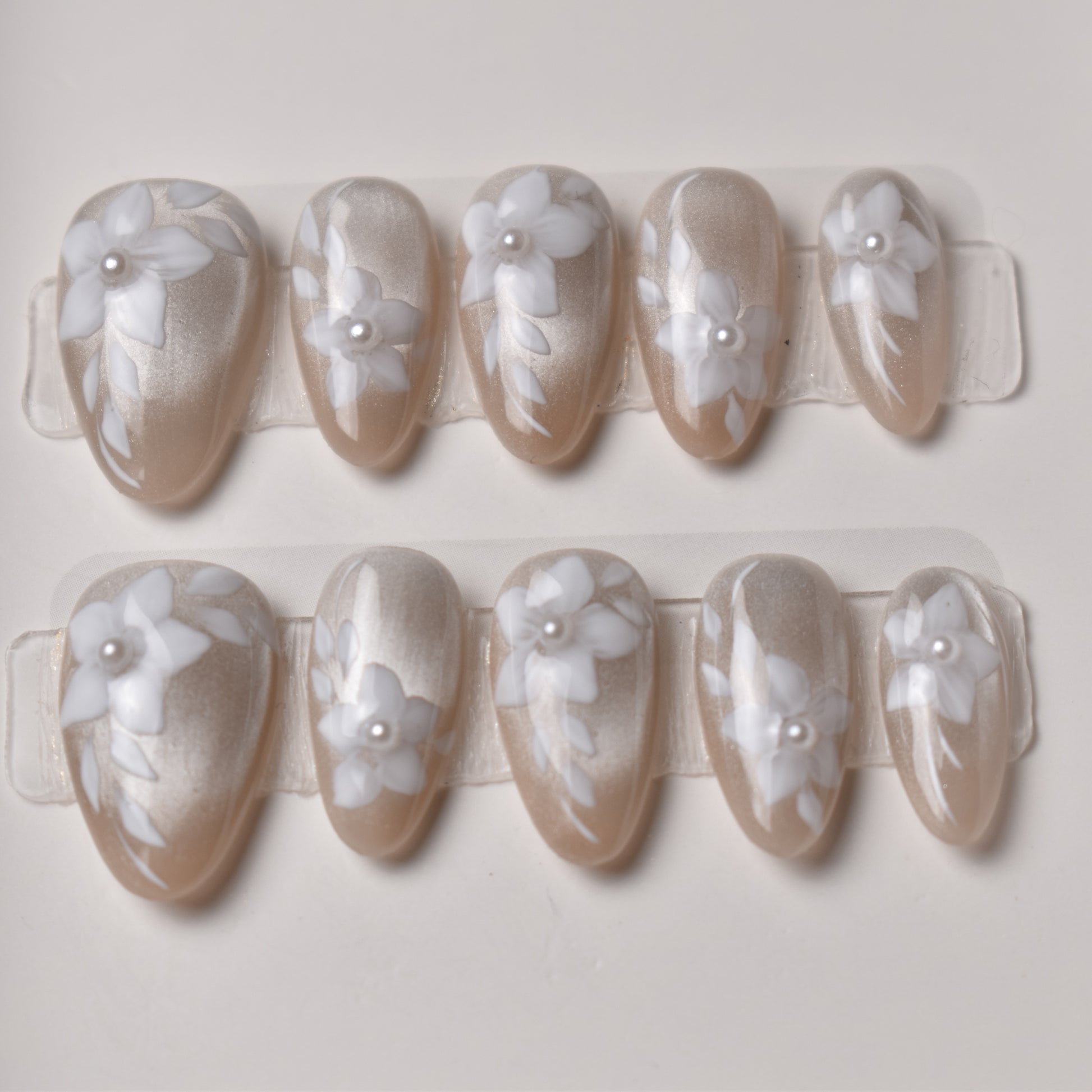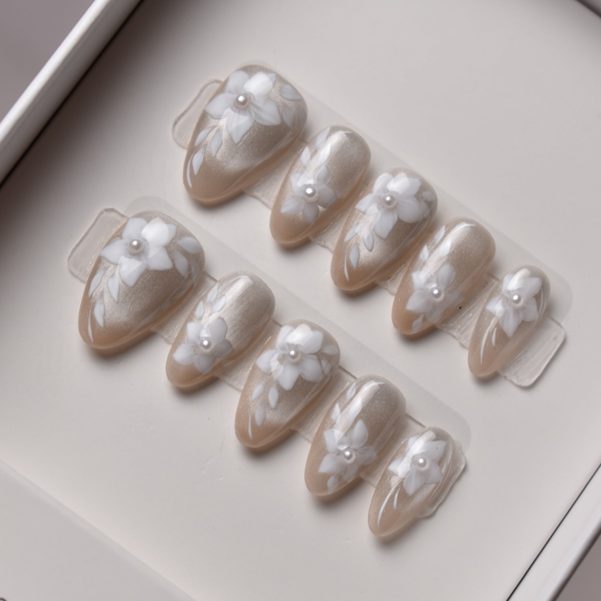 Soft champagne shimmer hosts crisp white flowers with pearl centers, trailing gently across each nail like blossoms in a meadow. The design radiates quiet sophistication. Perfect for weddings, christenings, and moments of pure simplicity.