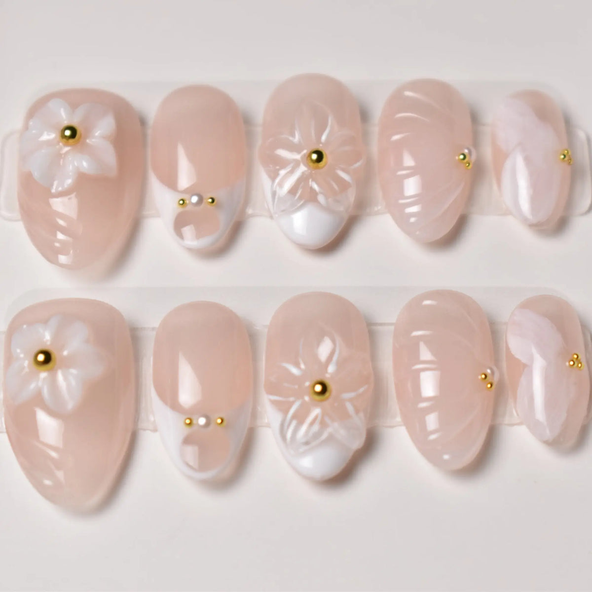 Gentle as a whisper, these nails bloom with creamy white flowers against a sheer blush backdrop. Golden centers glint softly, recalling the fleeting grace of petals drifting in warm spring air.