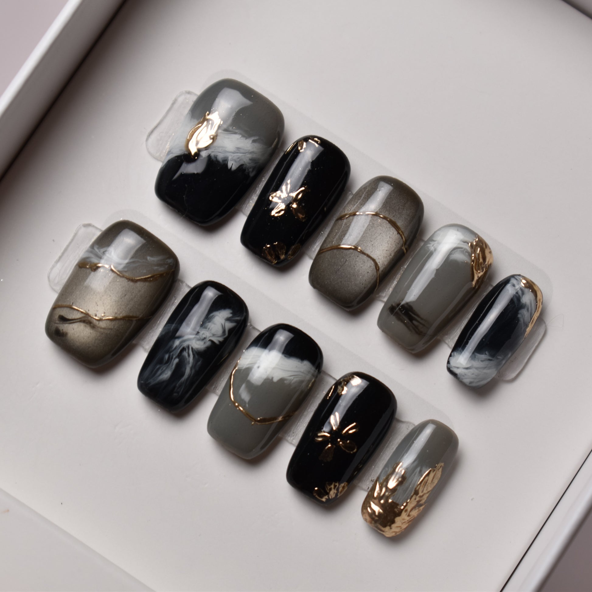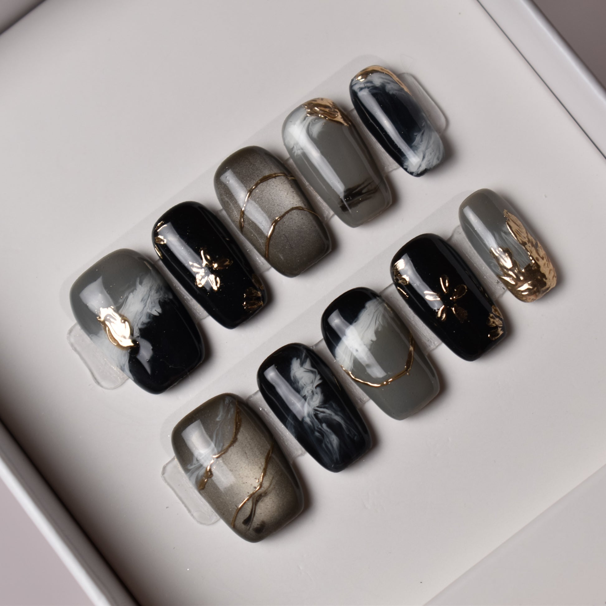 A high-gloss black gel melts into smokey gray gradients, layered with hand-brushed white swirls reminiscent of traditional Japanese suminagashi ink marbling. Thin metallic gold lines and tiny foil floral accents add a touch of quiet luxury against the moody, inky backdrop.