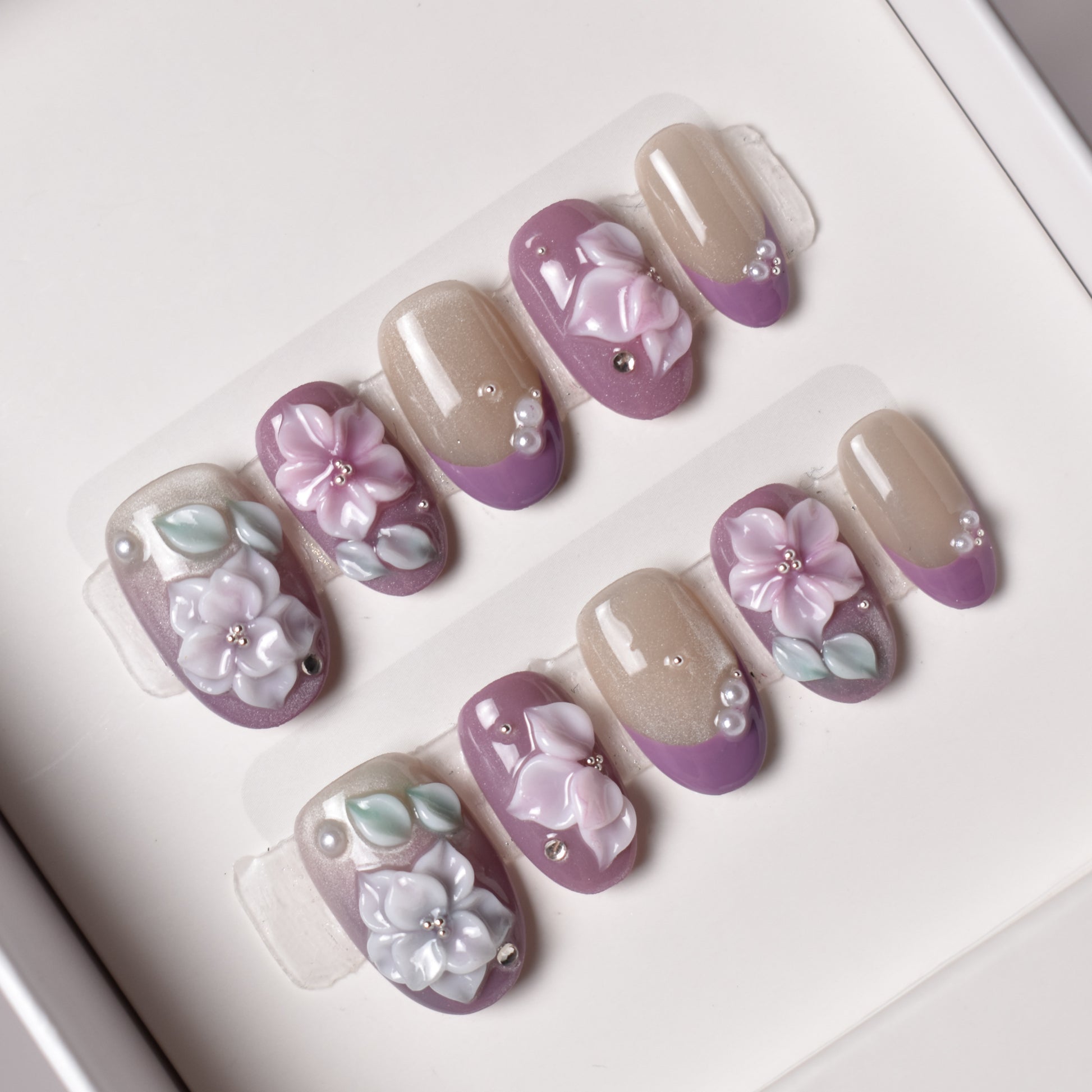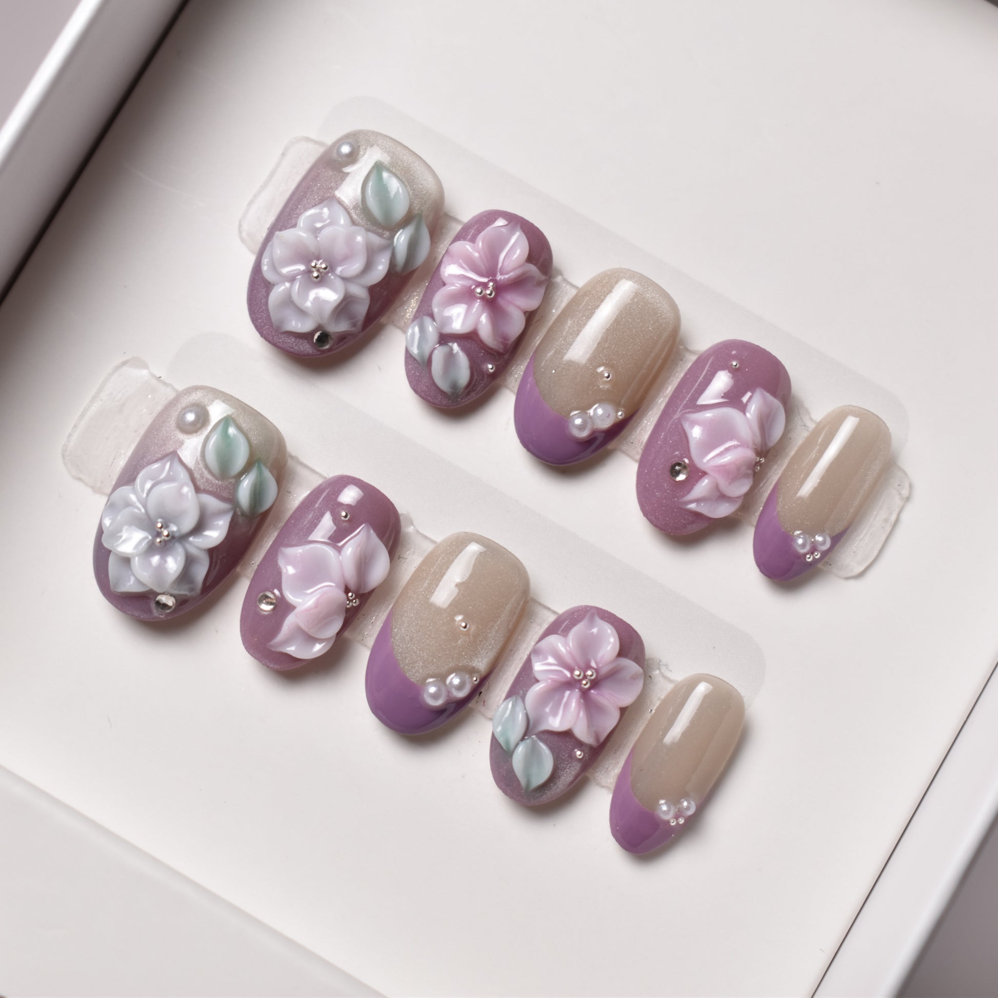 Deep violet blooms unfold on a pearl-lit base, their petals kissed with silver like frost in moonlight. Pearls glisten softly, as if cradled by the night sky. The design recalls a tranquil garden in early spring, where each flower glows beneath the watchful gaze of the moon.