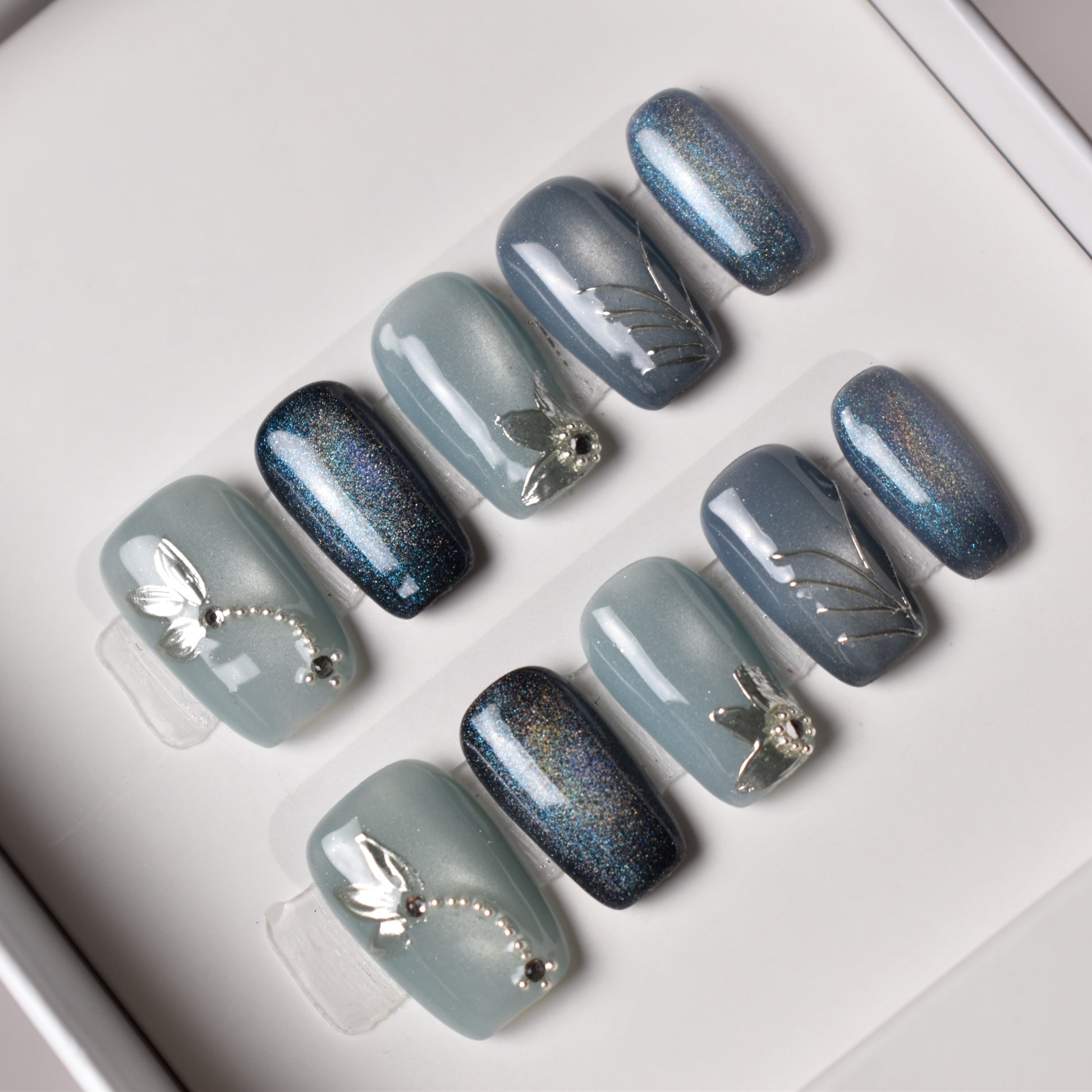 - 10 uniquely designed, hand-painted press-on nails made with high-quality UV gel.