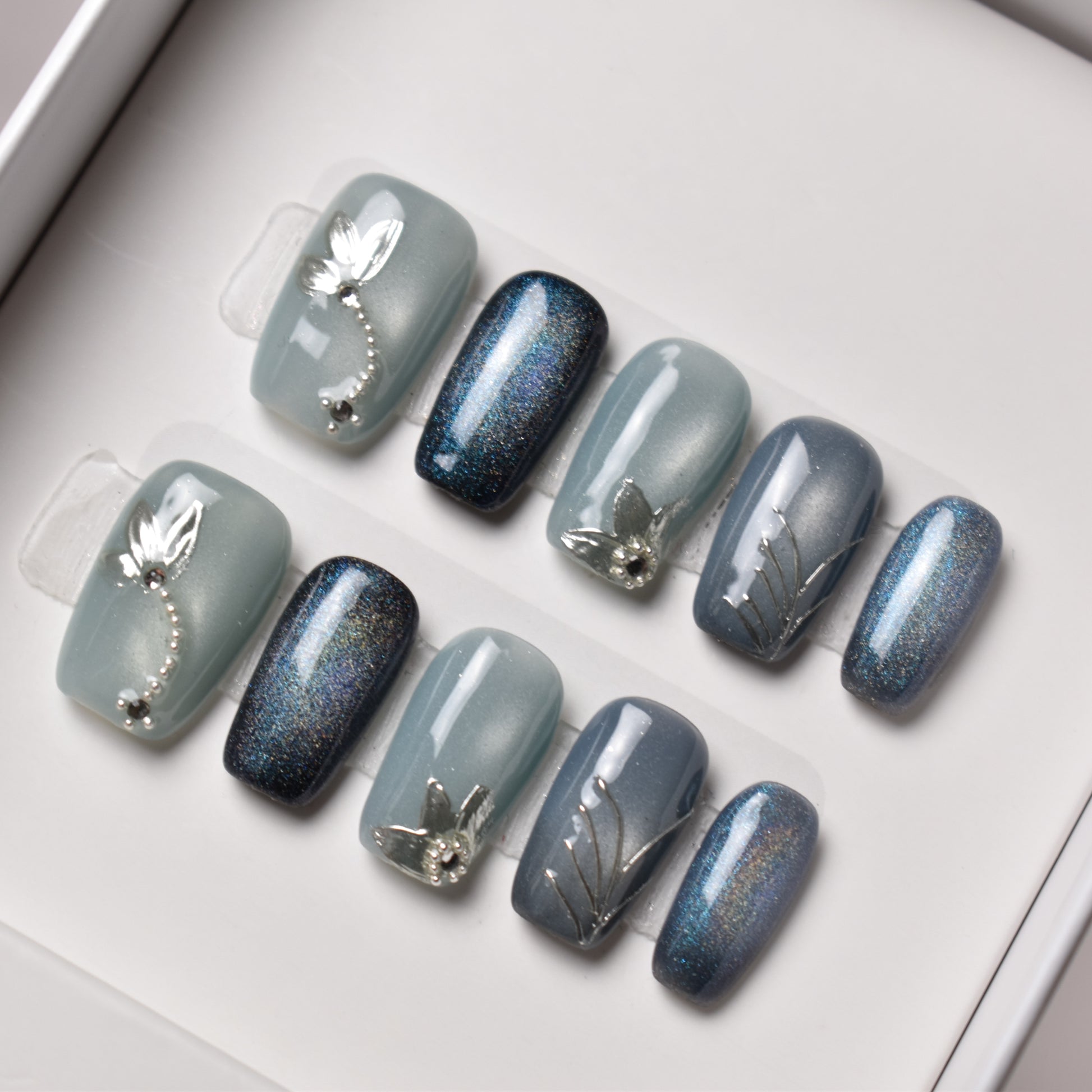Lake-mist gradients flow from celadon to steel blue with a subtle cosmic sheen, where silver dragonflies and airy wing lines drift serenely for a luminous, nature-kissed finish.