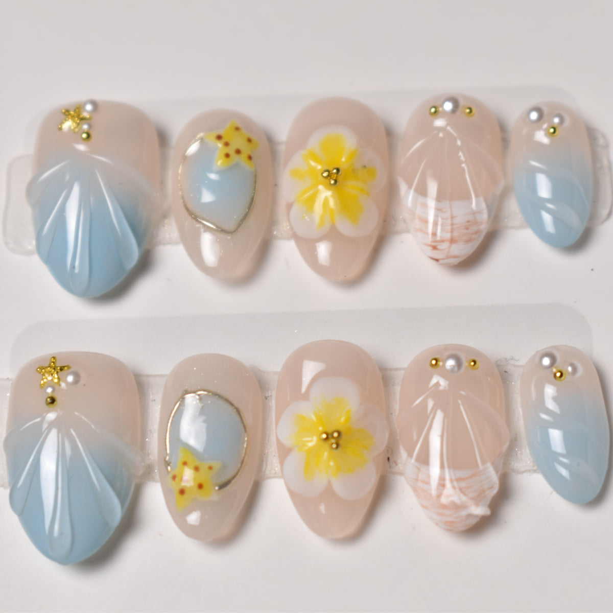 - 10 uniquely designed, hand-painted press-on nails made with high-quality UV gel.