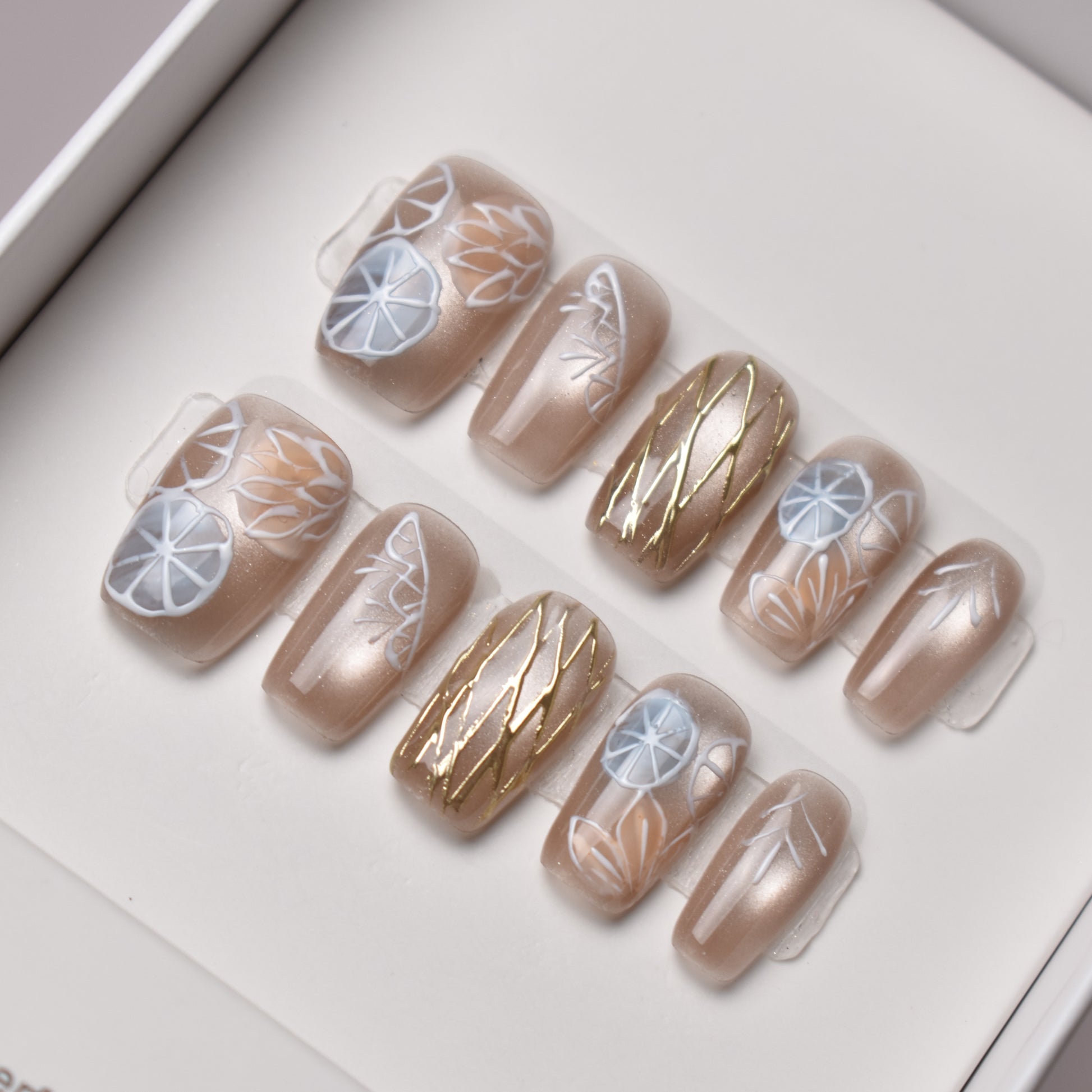 - 10 uniquely designed, hand-painted press-on nails made with high-quality UV gel.