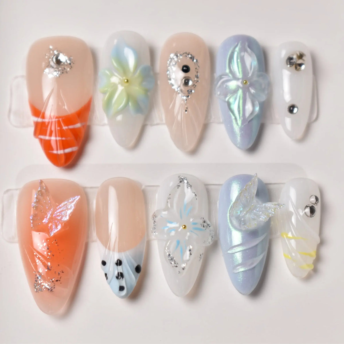 Soft pastels and shifting holographic sheens become a stage for ethereal blooms and delicate butterfly motifs. Tiny crystal studs glimmer like morning frost on fragile wings, while each color shift feels like a breath of air caught in motion. Perfect for days that balance elegance with lighthearted wonder.