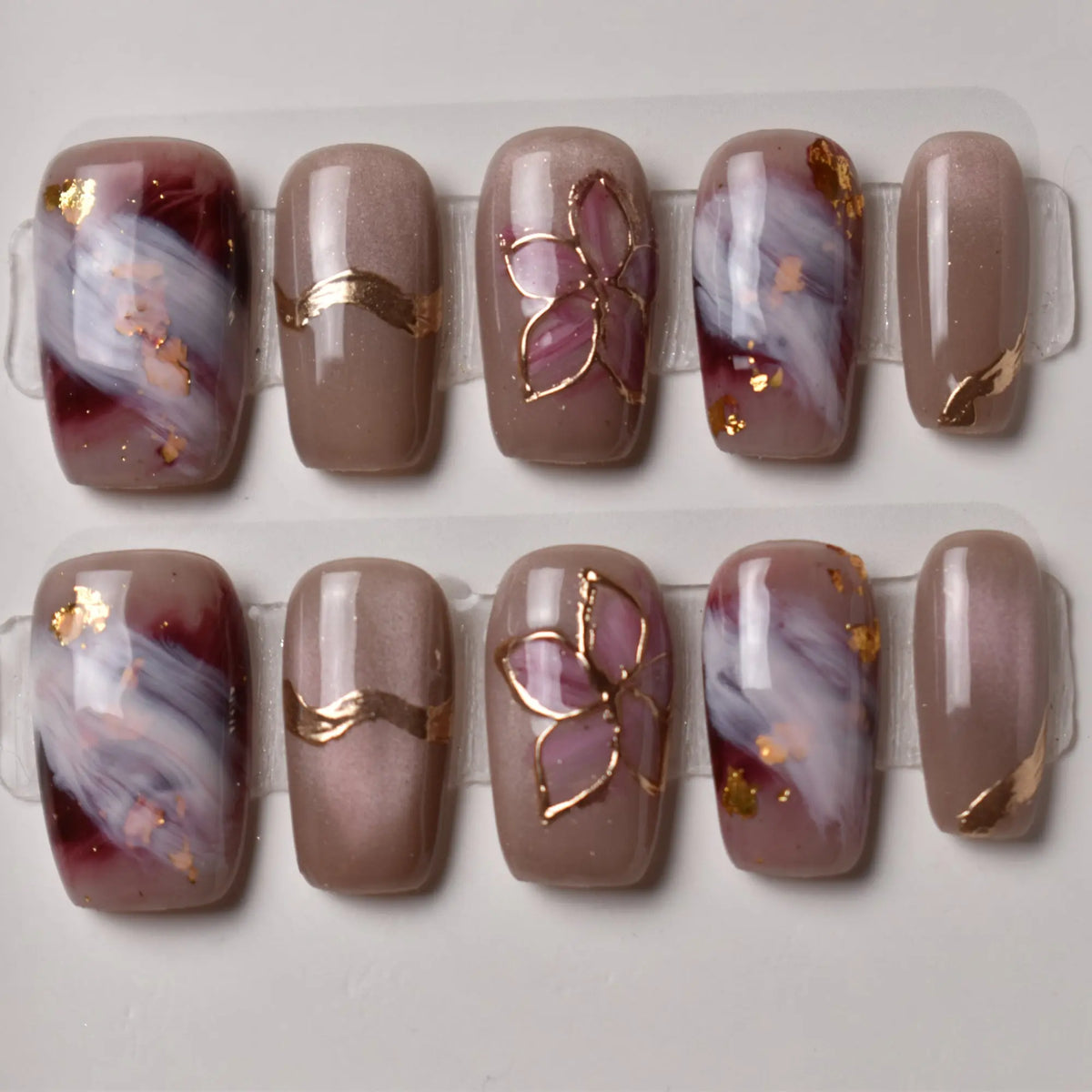 - 10 uniquely designed, hand-painted press-on nails made with high-quality UV gel.