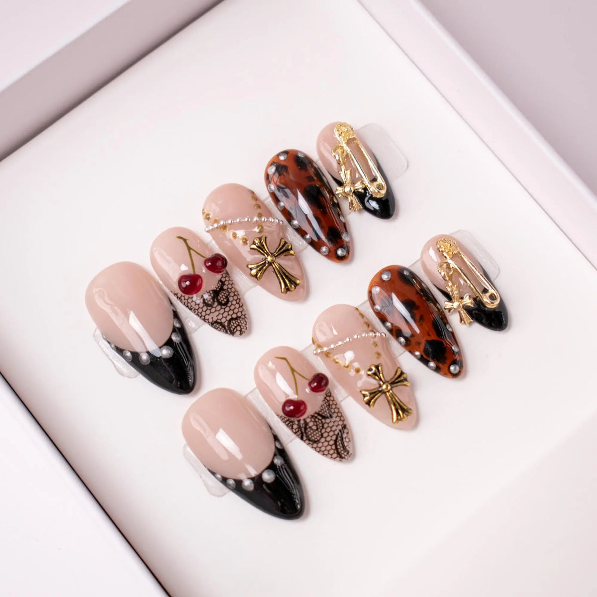 A rebellious yet glamorous set that fuses edgy street style with luxurious accents. Nude base nails are contrasted with sharp black French tips adorned with miniature pearls for a polished twist. Playful cherry motifs sit atop sheer lace-effect tips, bringing a flirty and retro vibe. Rich tortoiseshell patterns add depth and warmth, while gold crosses, tiny pearls, and safety pin charms create a punk-inspired statement. Perfect for anyone who loves bold fashion, vintage touches, and a hint of mischief in their manicure.
