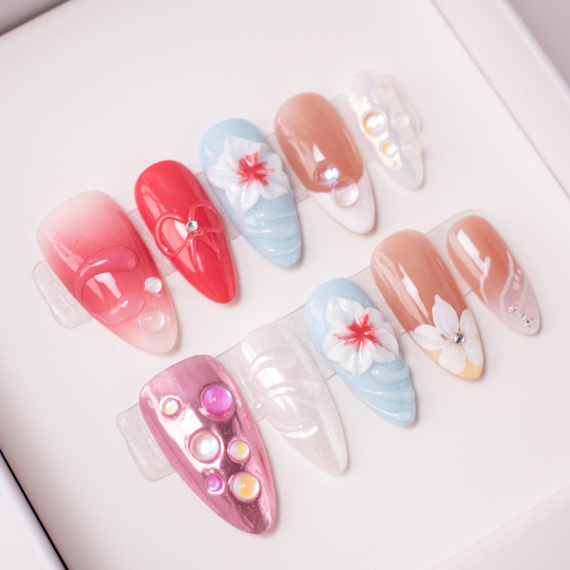 - 10 uniquely designed, hand-painted press-on nails made with high-quality UV gel.