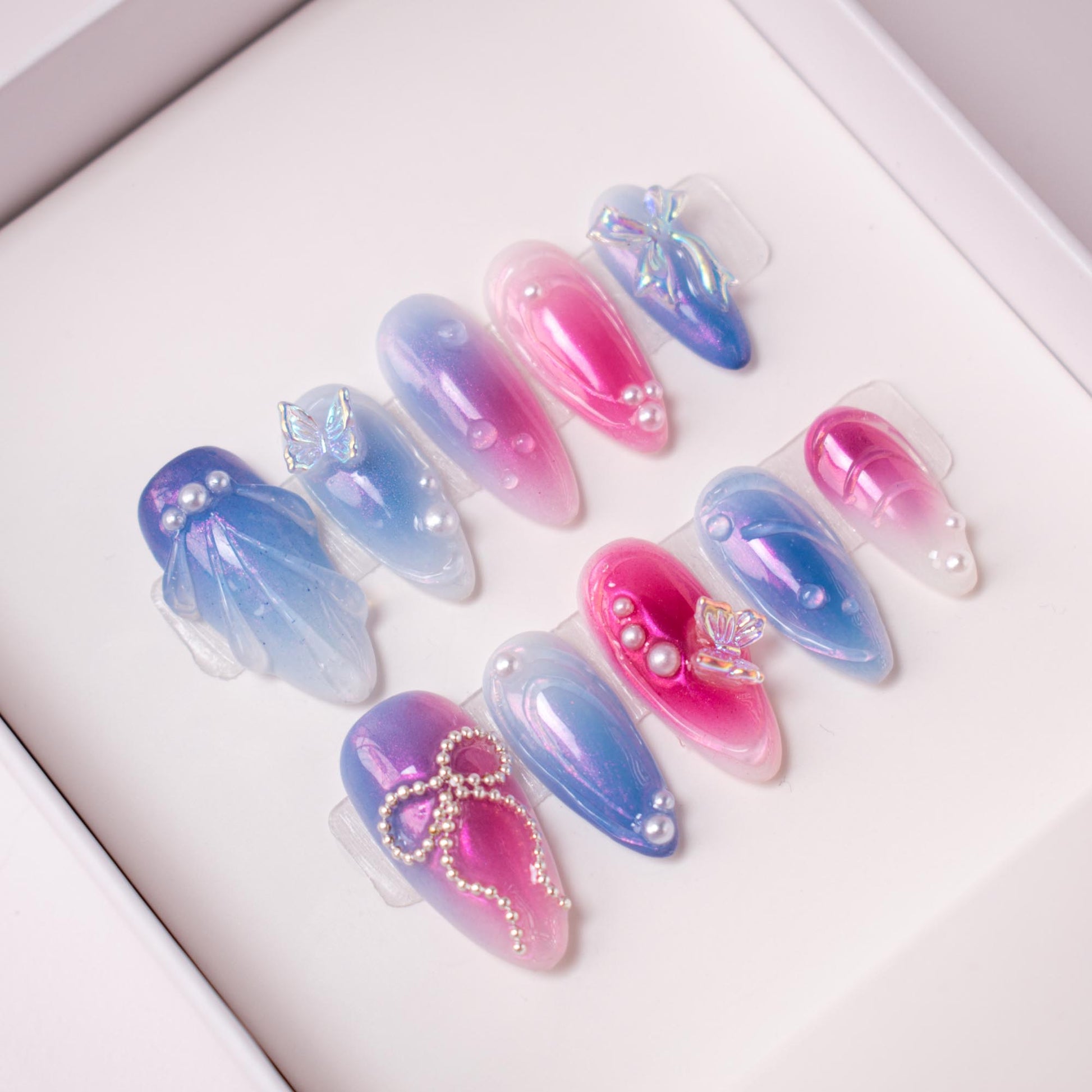 - 10 uniquely designed, hand-painted press-on nails made with high-quality UV gel.