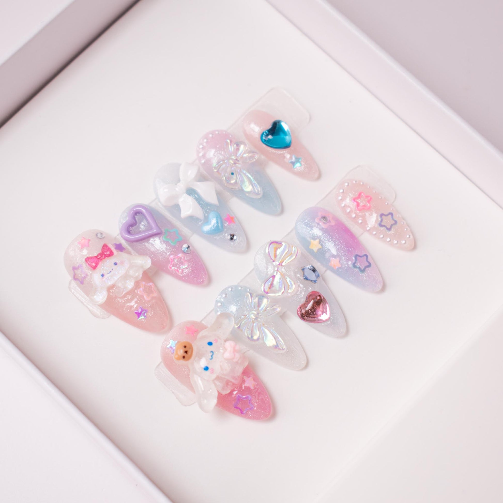 - 10 uniquely designed, hand-painted press-on nails made with high-quality UV gel.