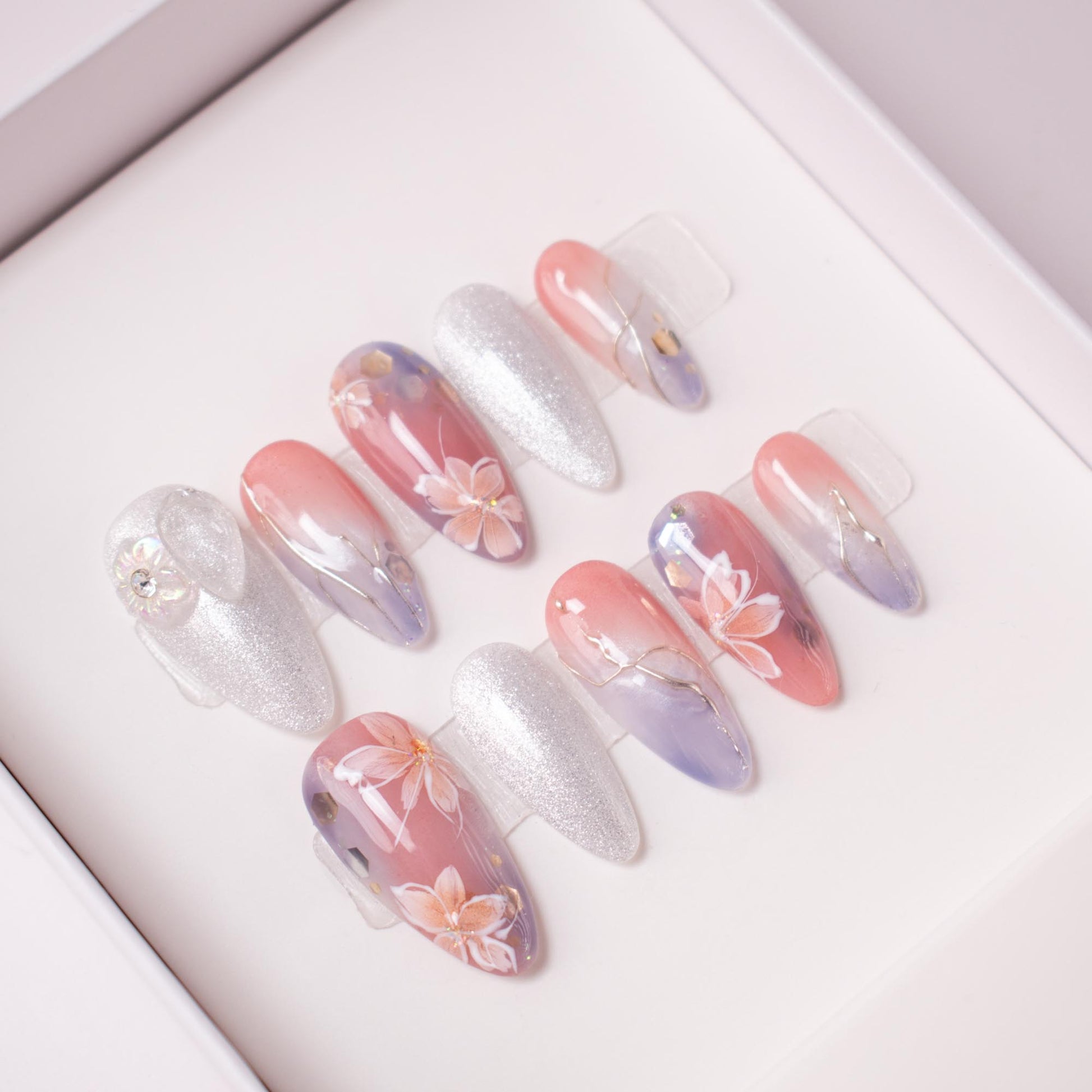 - 10 uniquely designed, hand-painted press-on nails made with high-quality UV gel.