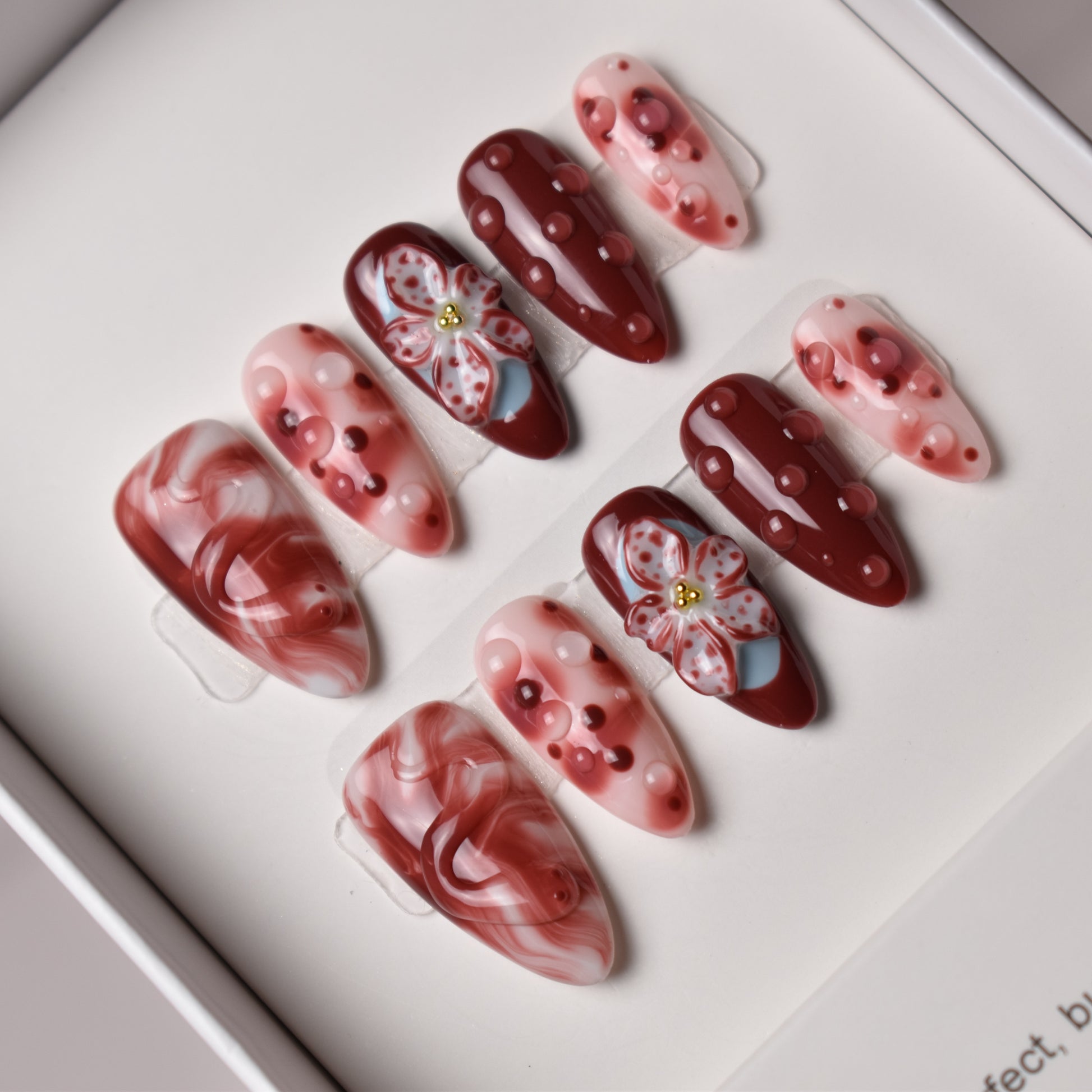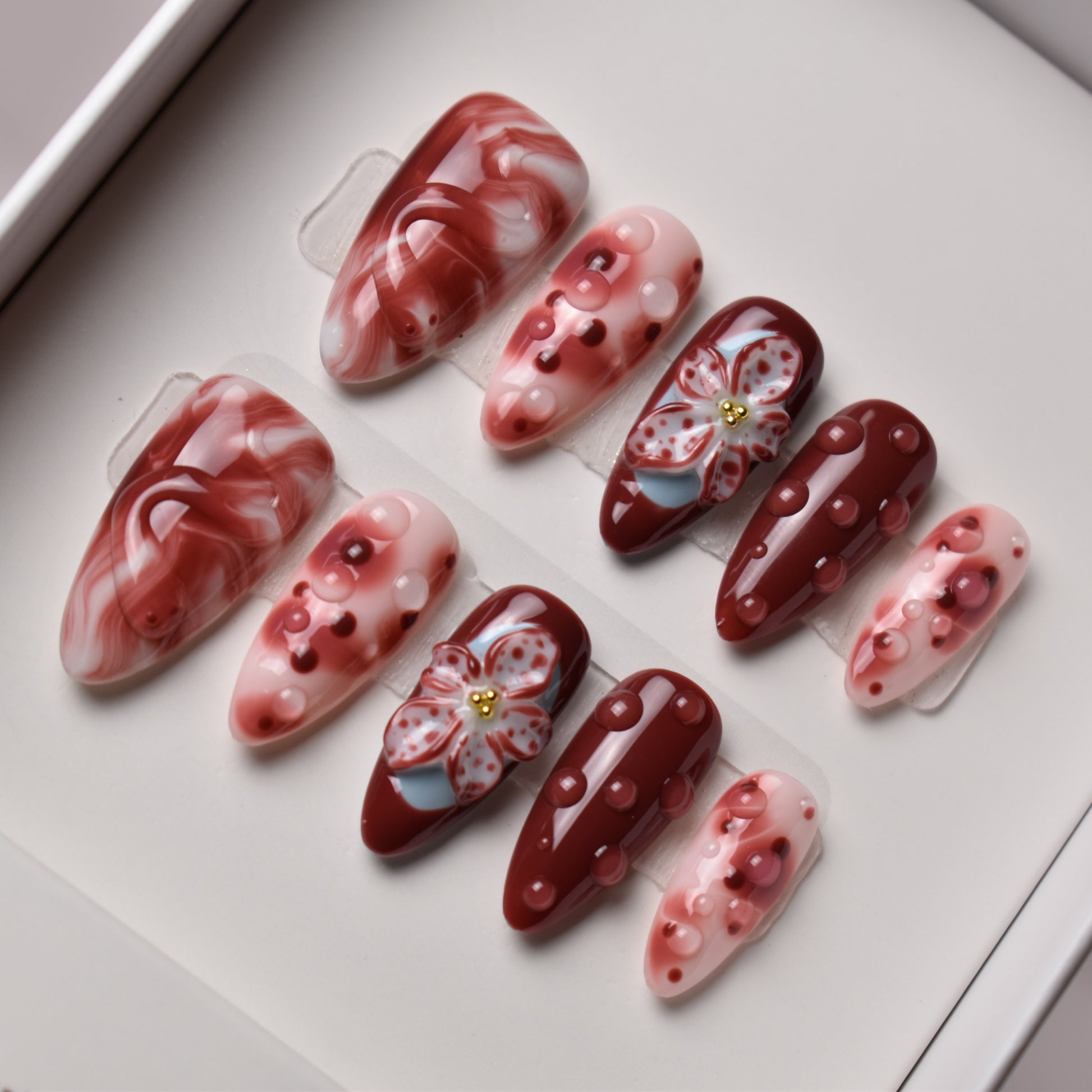 A playful dance of crimson and blush swirls forms the base of this lively set, embellished with glossy dome accents and whimsical polka dots. Two statement nails feature 3D bows in patterned red and blue, adding a charming, vintage feel. With its bold color contrast and joyful textures, this set is perfect for spring carnivals, retro-inspired looks, and days when you want your nails to tell a cheerful story.